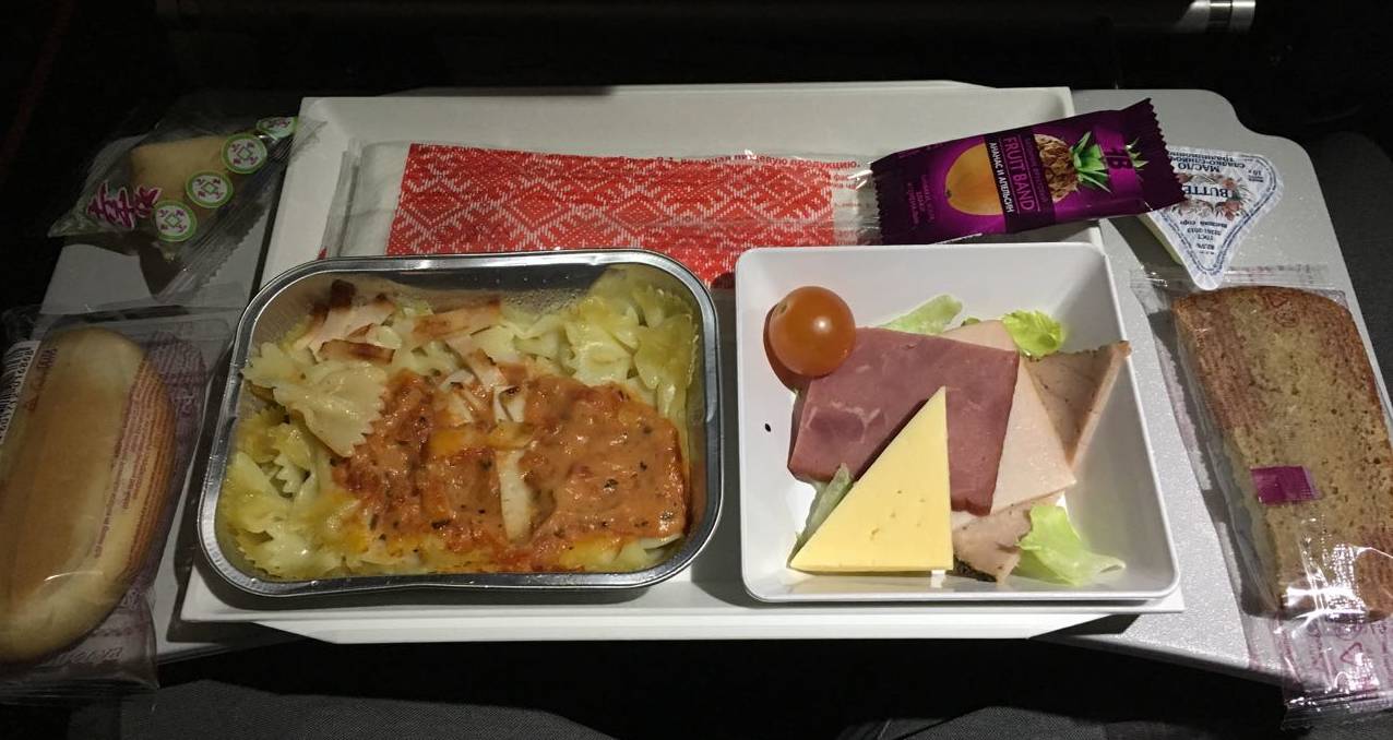 While this dinner service wasn't as extensive as the first, it was definitely more than you'd get on any Western European or US airline. The appetizer consisted of cold cuts and semi-soft white cheese. For the main dish, the flight attendant asked if I wanted "pasta" or "ravioli." I presumed she must have been joking, and that if I ordered the pasta, it was going to be the spinach ravioli I'd remembered seeing on the menu. However, this was not the case — it was farfalle noodles with processed chicken morsels... and it didn't taste great. Otherwise, though, I was happy with my meal service, which concluded with lemon tea.