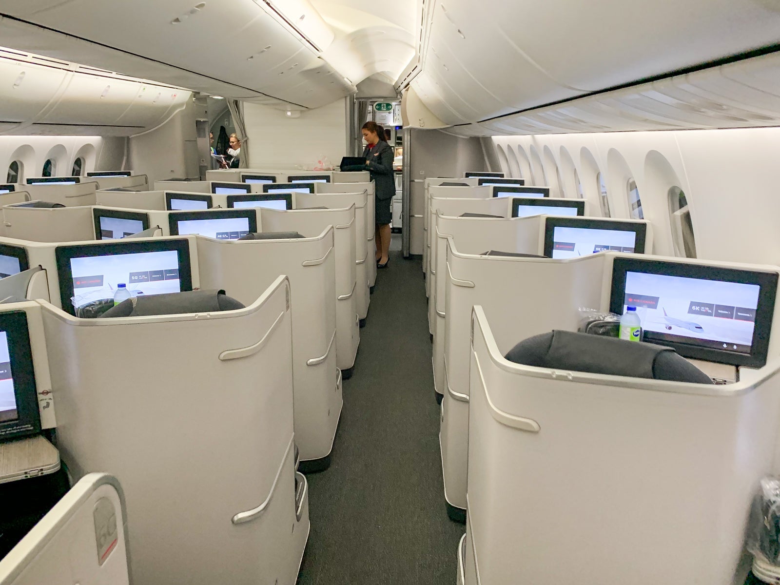 All passengers boarded through Door L2, so I turned left into the business-class cabin. The cabin consisted of 30 seats, with eight along each window and seven pairs in the middle.