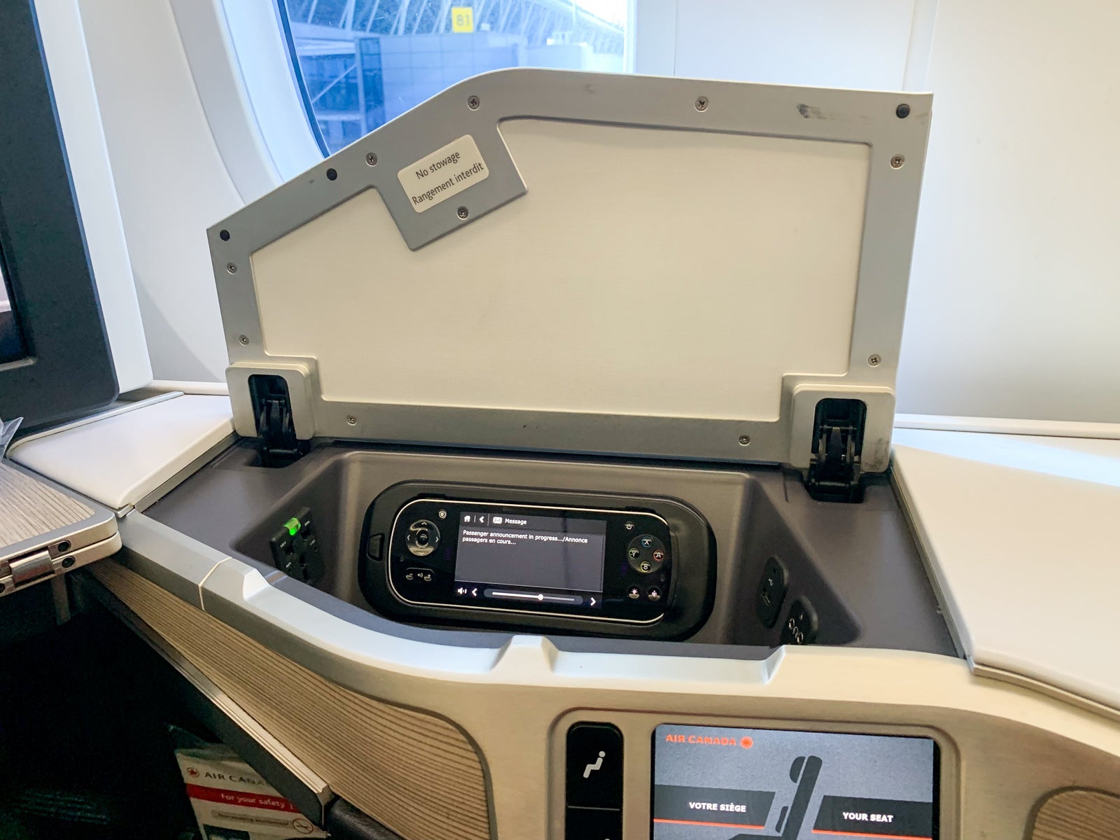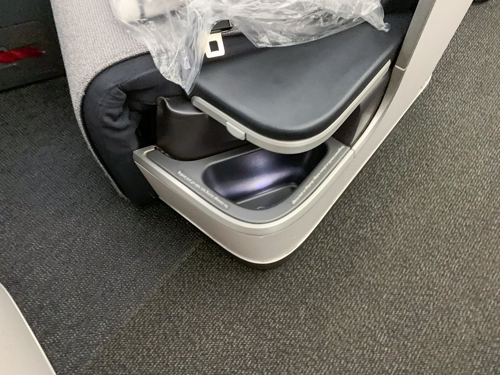 Everything else I stuck in the main storage compartment to the right of the seat, which is also where the inflight-entertainment remote and outlets were.