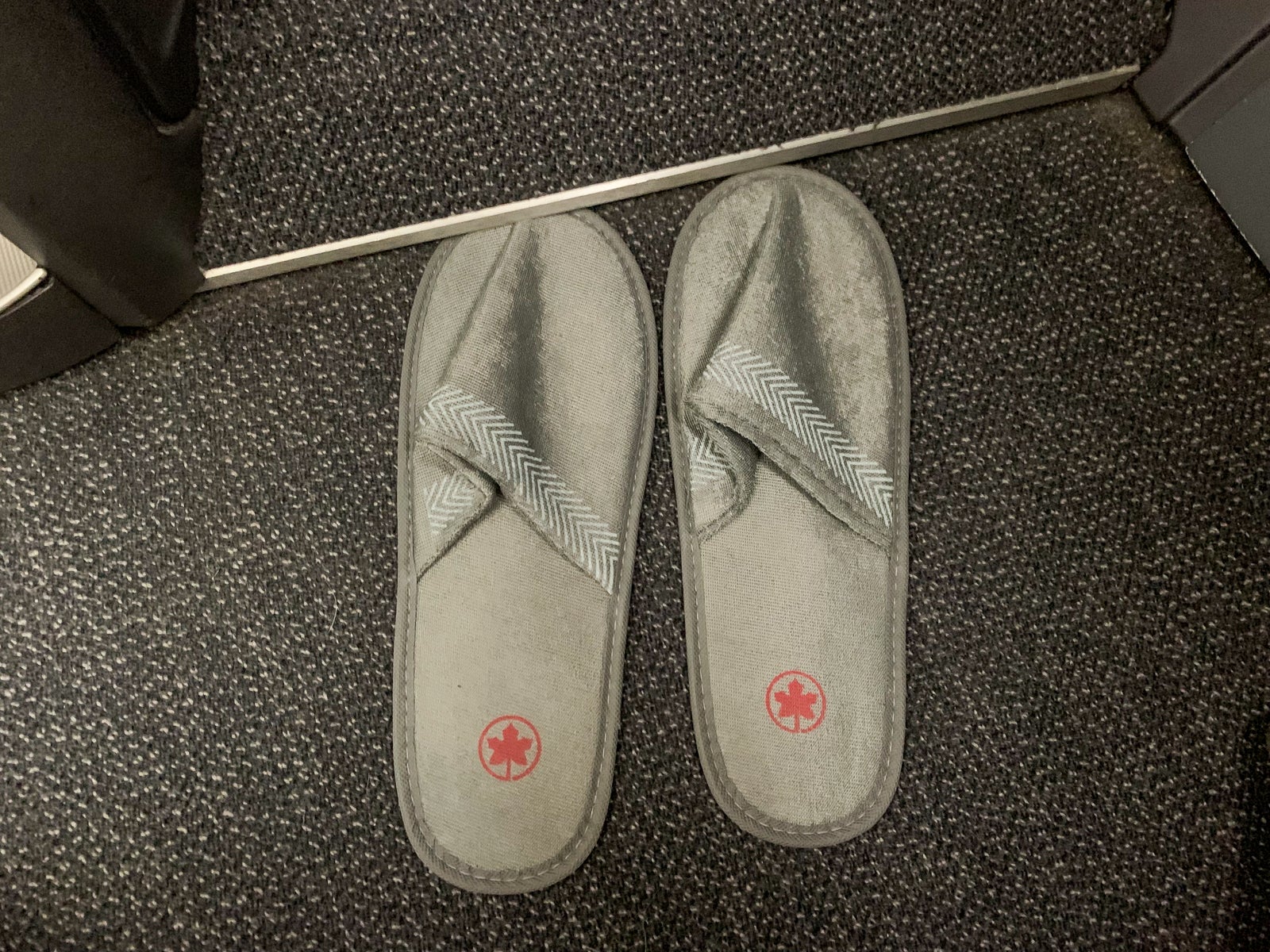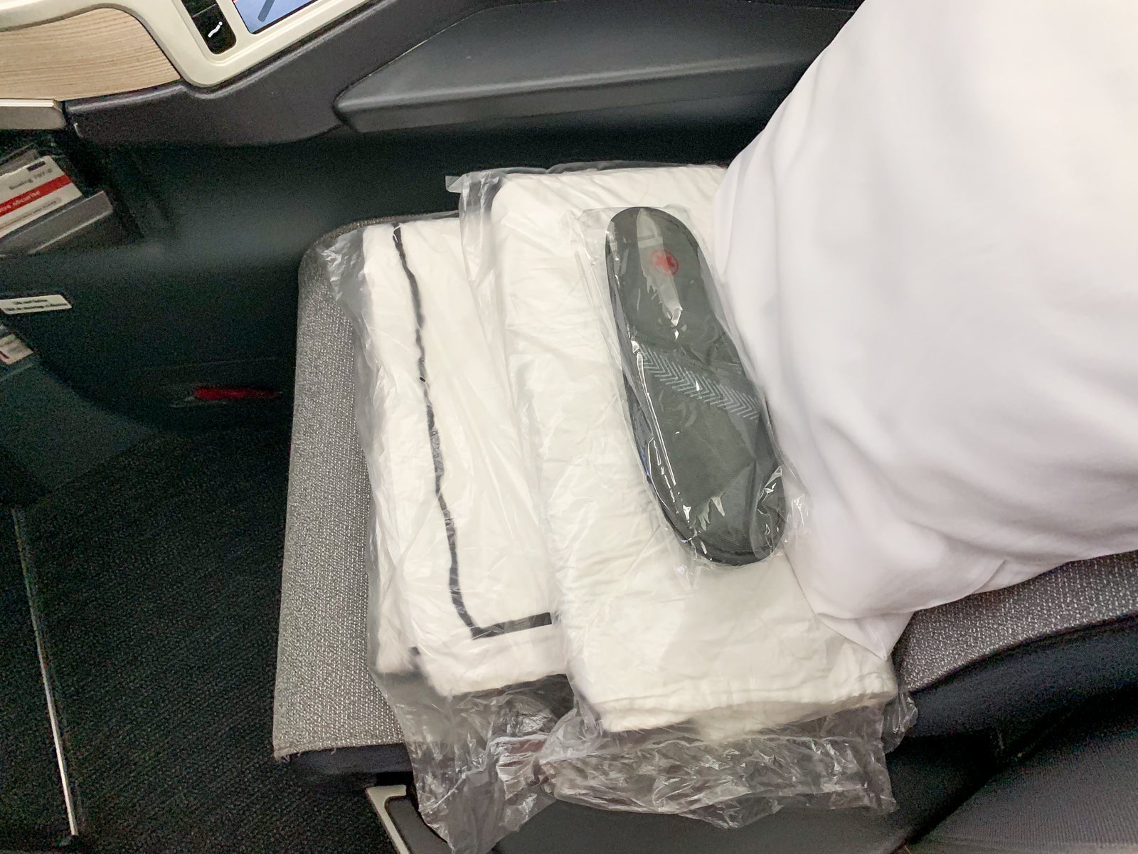 Upon boarding, my seat was piled high with bedding (which I stowed in the overhead bin until I was ready to sleep) and a pair of slippers.