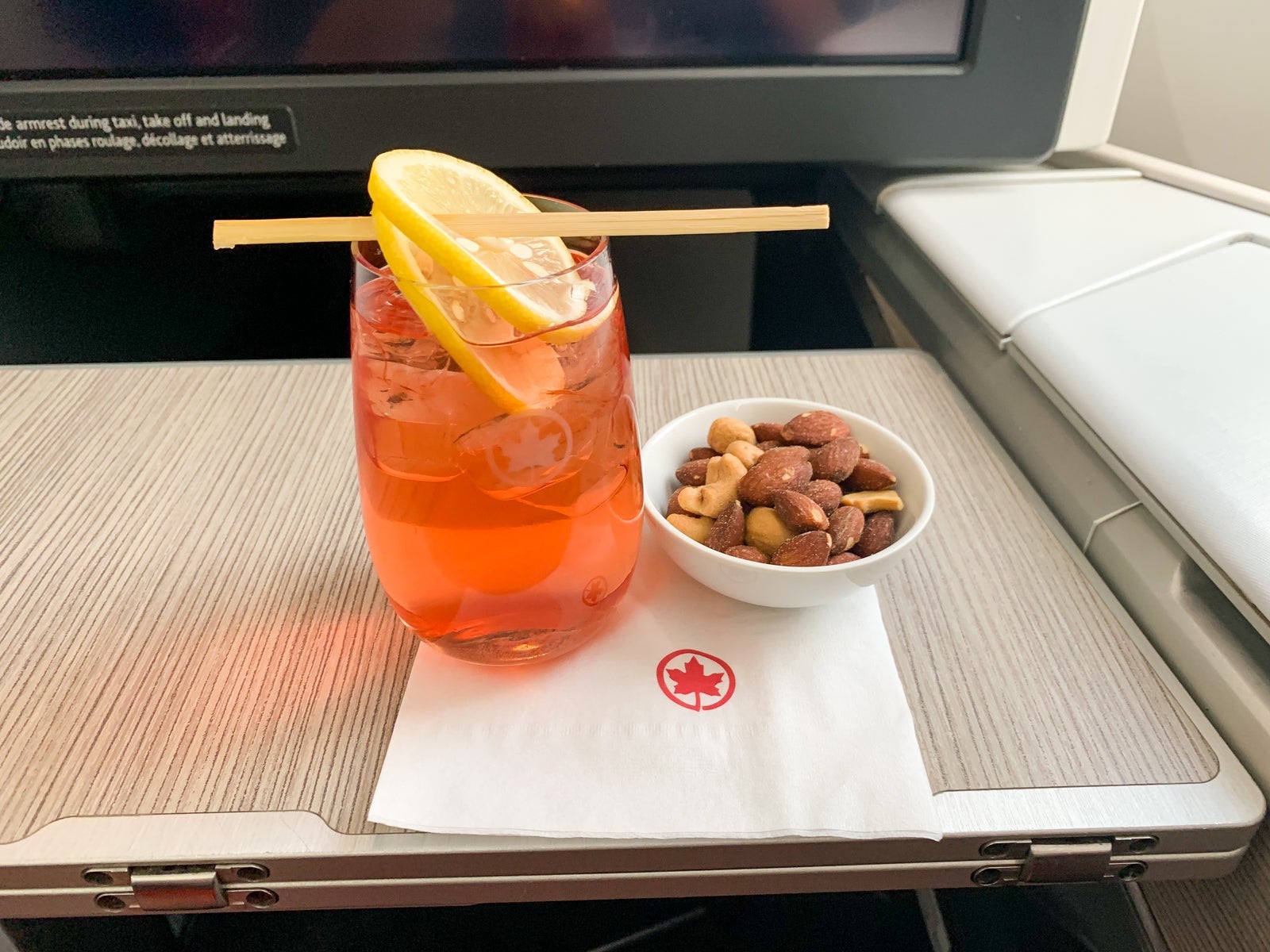 Once the seatbelt sign was turned off, flight attendants came through the cabin distributing hot towels. About 35 minutes after takeoff, they began serving drinks and mixed nuts. I tried the Air Canada signature cocktail, a mix of Crown Royal Canadian whiskey, gin and cranberry juice. Note that the bar selection was buried at the back of the menu, meaning you had to flip through the English, French and Chinese translations to see what drinks were available.