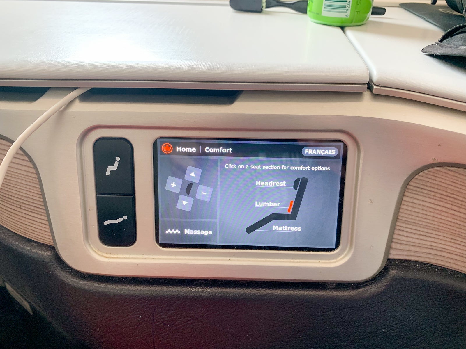 On the right side of the seat was a small monitor that could be used to adjust the individual components of the seat, including lumbar support. There were also preset buttons for takeoff and sleeping.