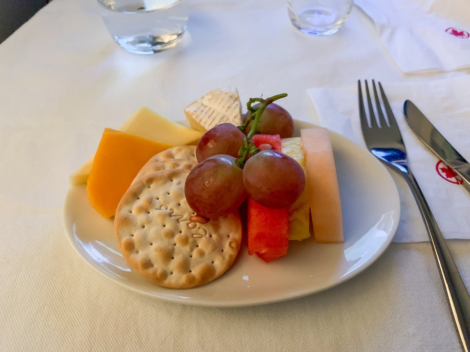 Next, I was offered a small fruit and cheese plate. While I normally get a dessert instead of cheese, Air Canada serves them as separate courses, so I ended up nibbling while I waited for dessert.