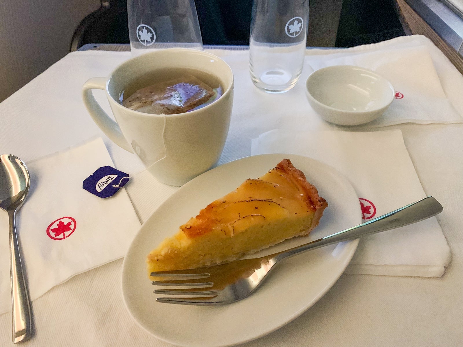 I got the omelet, which had been simply inedible on my previous Air Canada flight. I was proactively offered both ketchup and hot sauce, and even without them these eggs were much better than last time. This was accompanied by yogurt, fruit, a muffin, orange juice and another tea.