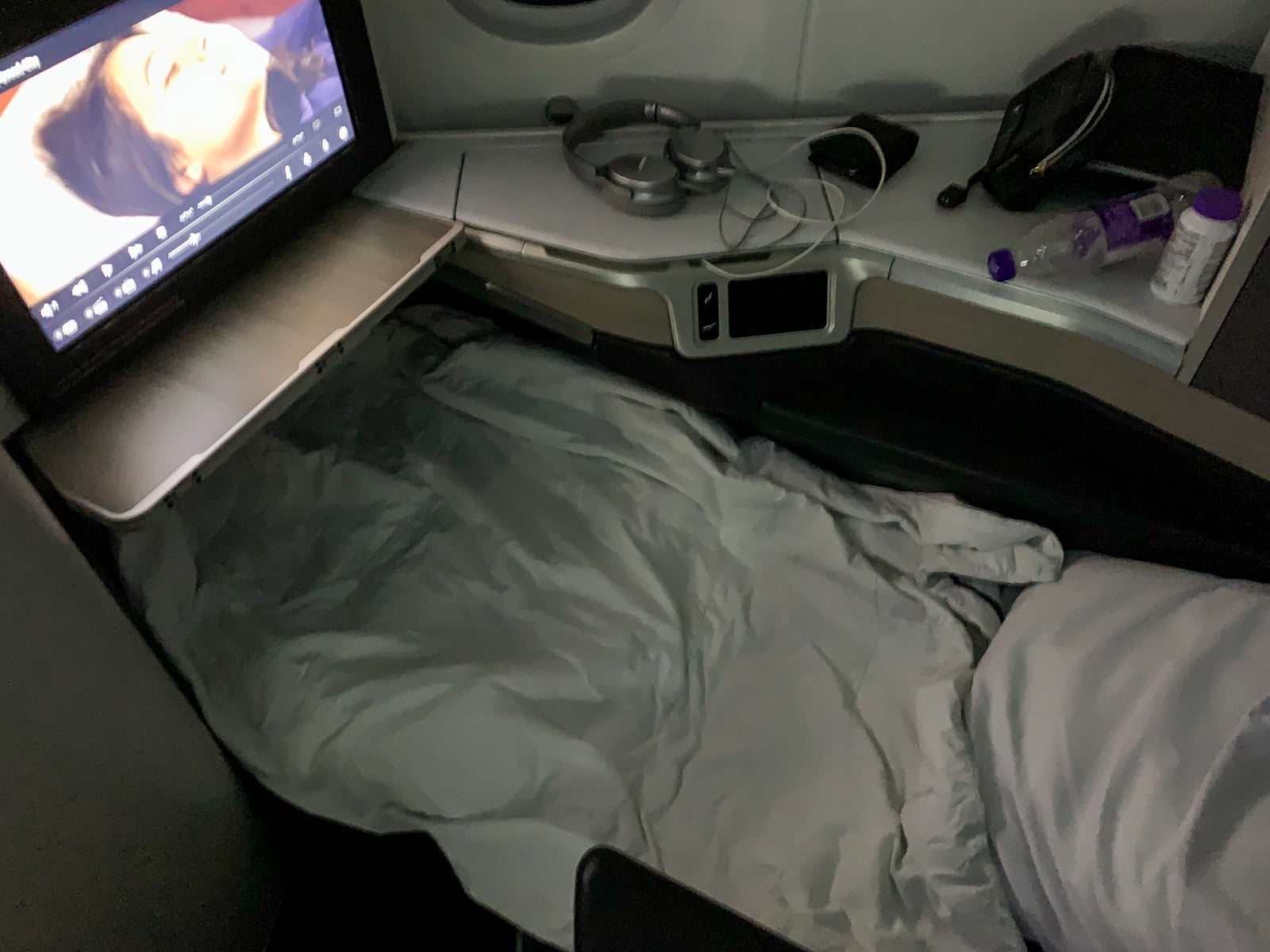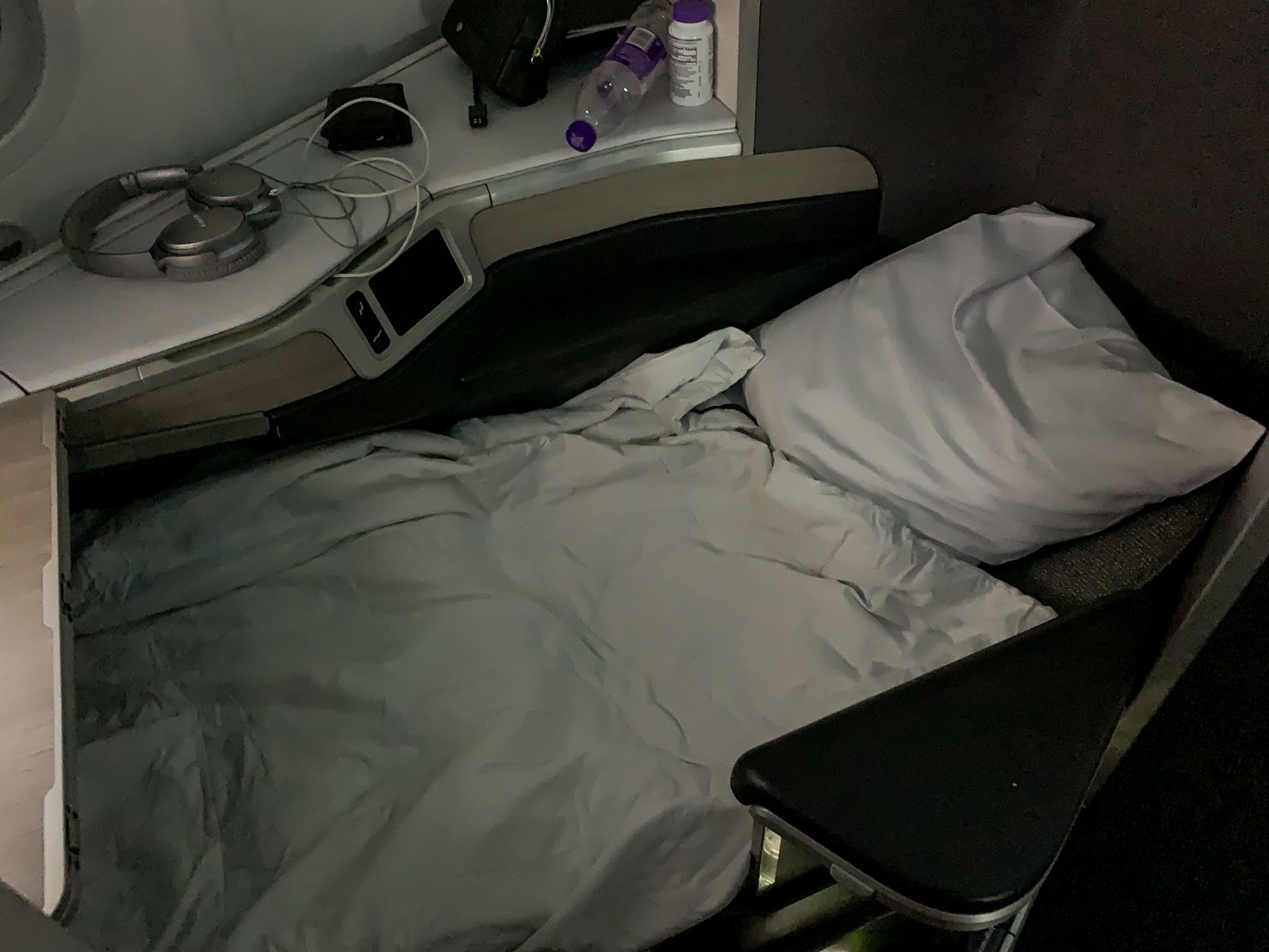 The bed was incredibly comfortable and private with the armrest raised, and I ended up getting a solid six hours of sleep.