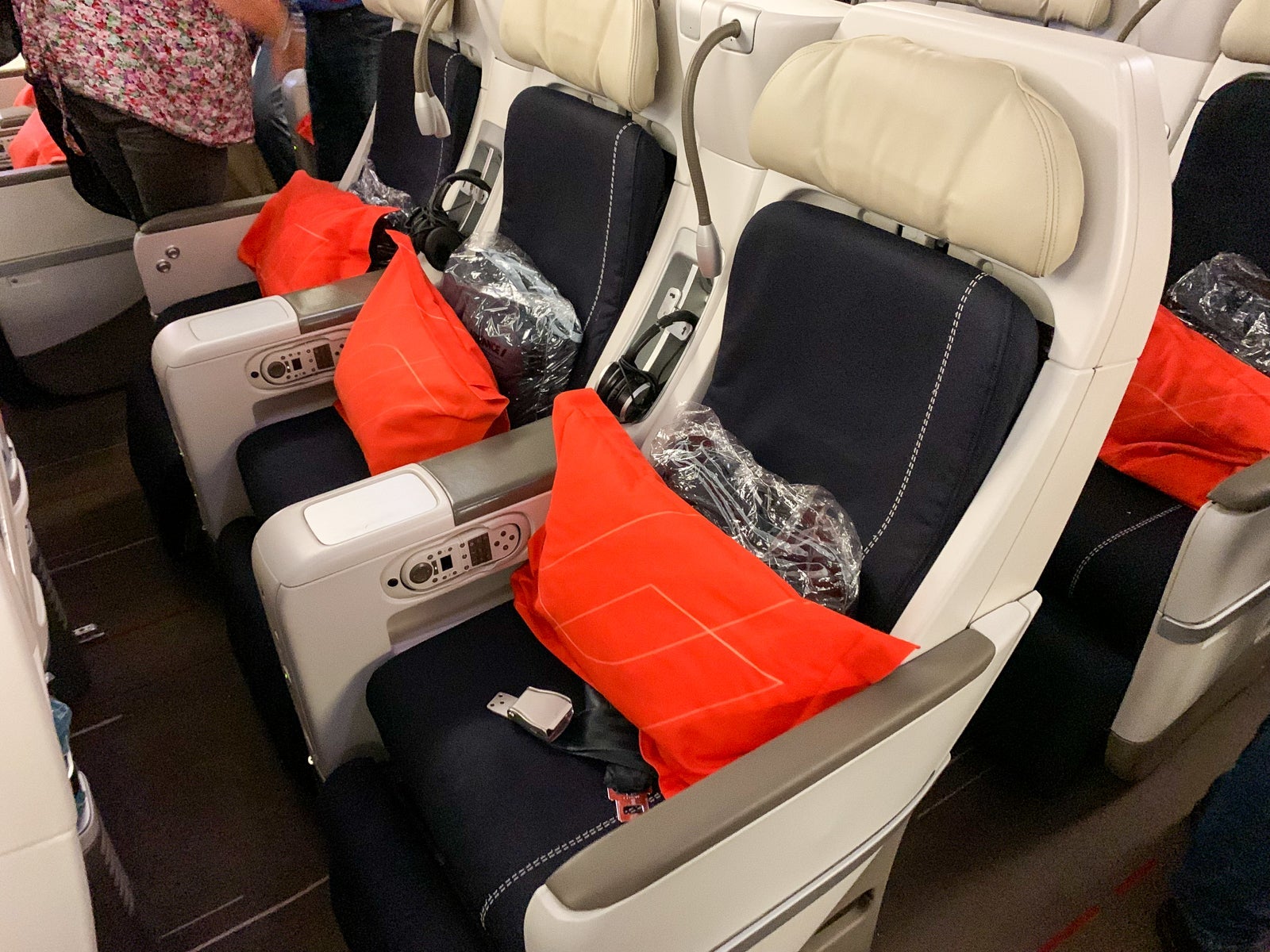 On paper, the seat statistics are good. Each one is 19 inches wide and has 38 inches of pitch — that's 1.5 inches wider than in economy and with six more inches for your legs. The seats are laid out in a tolerable 2-3-2 configuration, compared to 2-4-2 in the rows of regular economy behind us. (Most economy seats are on the lower deck.)