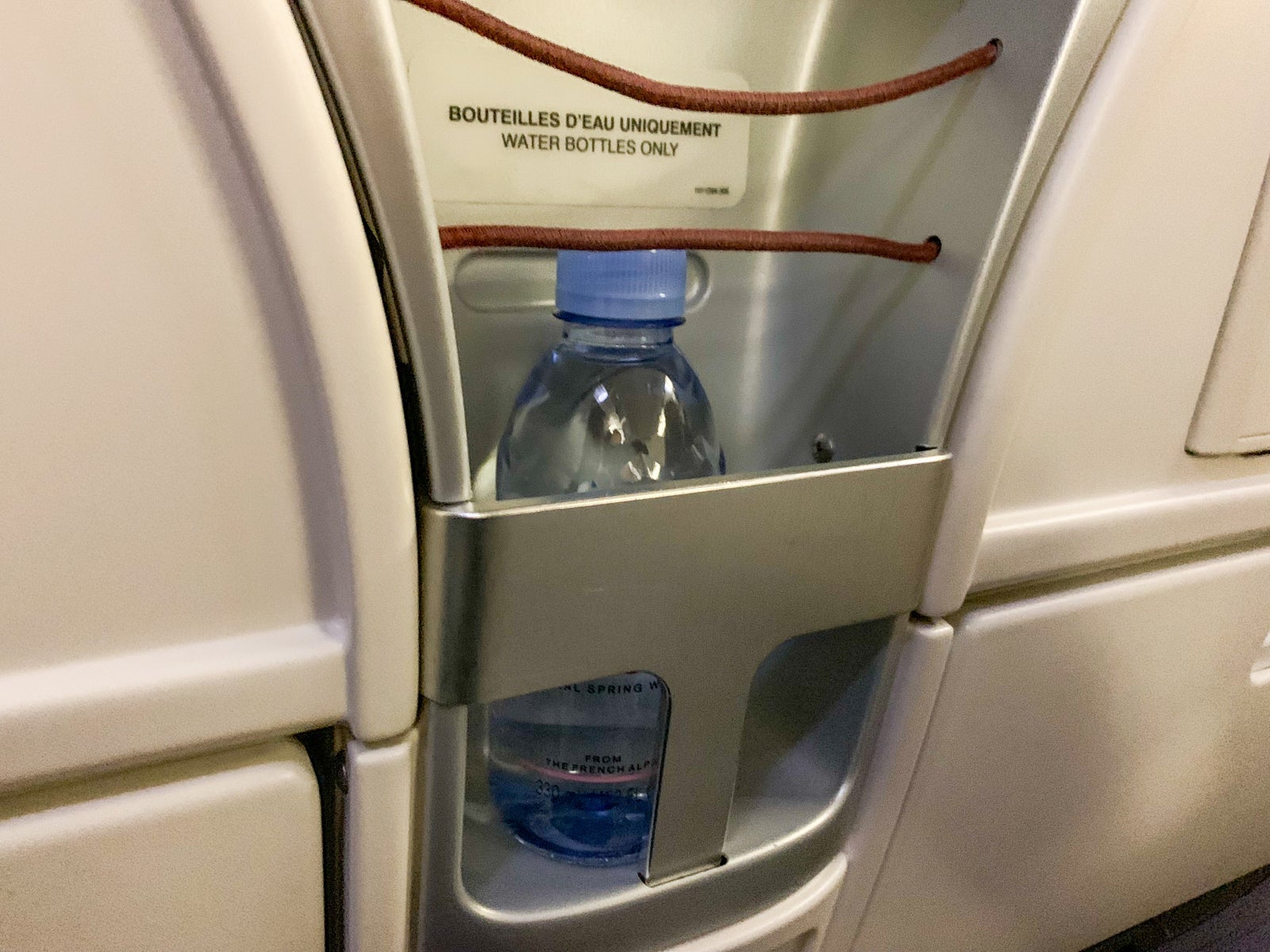 There was a large tray table that folded out, an international power outlet and USB outlet, and a nice spot to hold water bottles, which the airline provided. That water bottle holder was actually the best design element.
