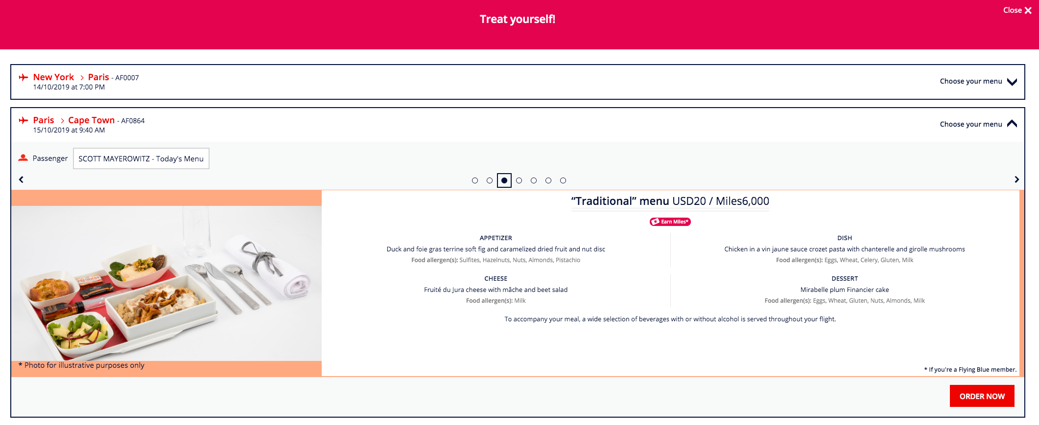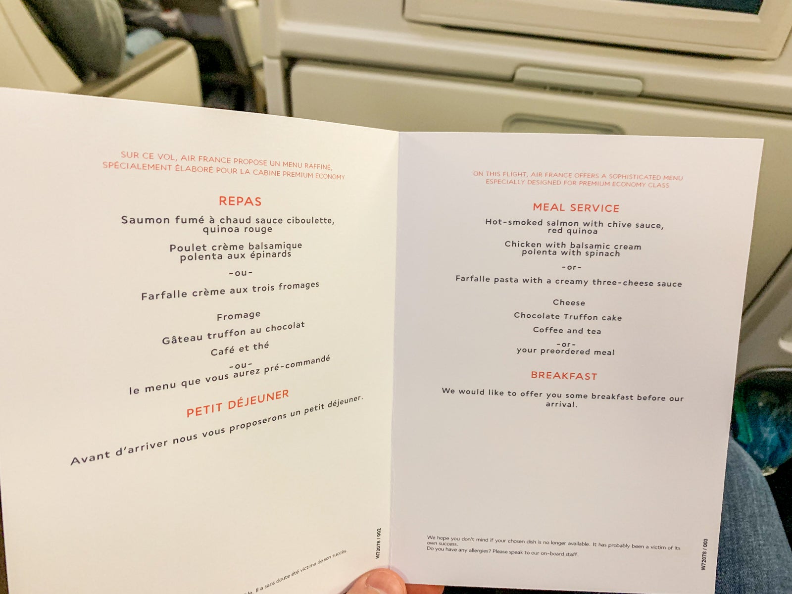 Air France does offer the option to purchase a premium meal in advance. I did that on my second leg, choosing the traditional French meal for an extra $20. It was better than anything I've had in coach before, but for that price, I should have just purchased a cold meal in the terminal and brought it on board.