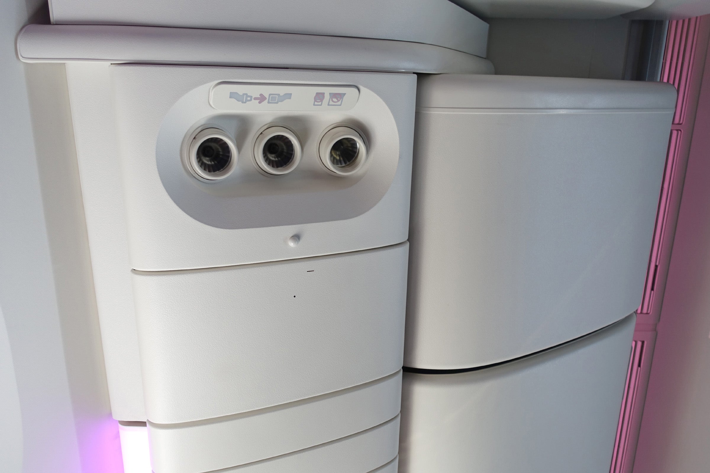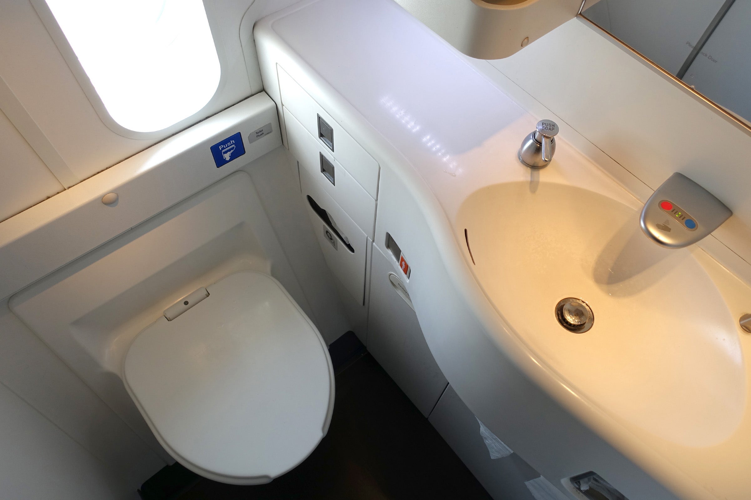 The 44 biz-class passengers have access to three lavatories — two between the cabins and one behind the cockpit.