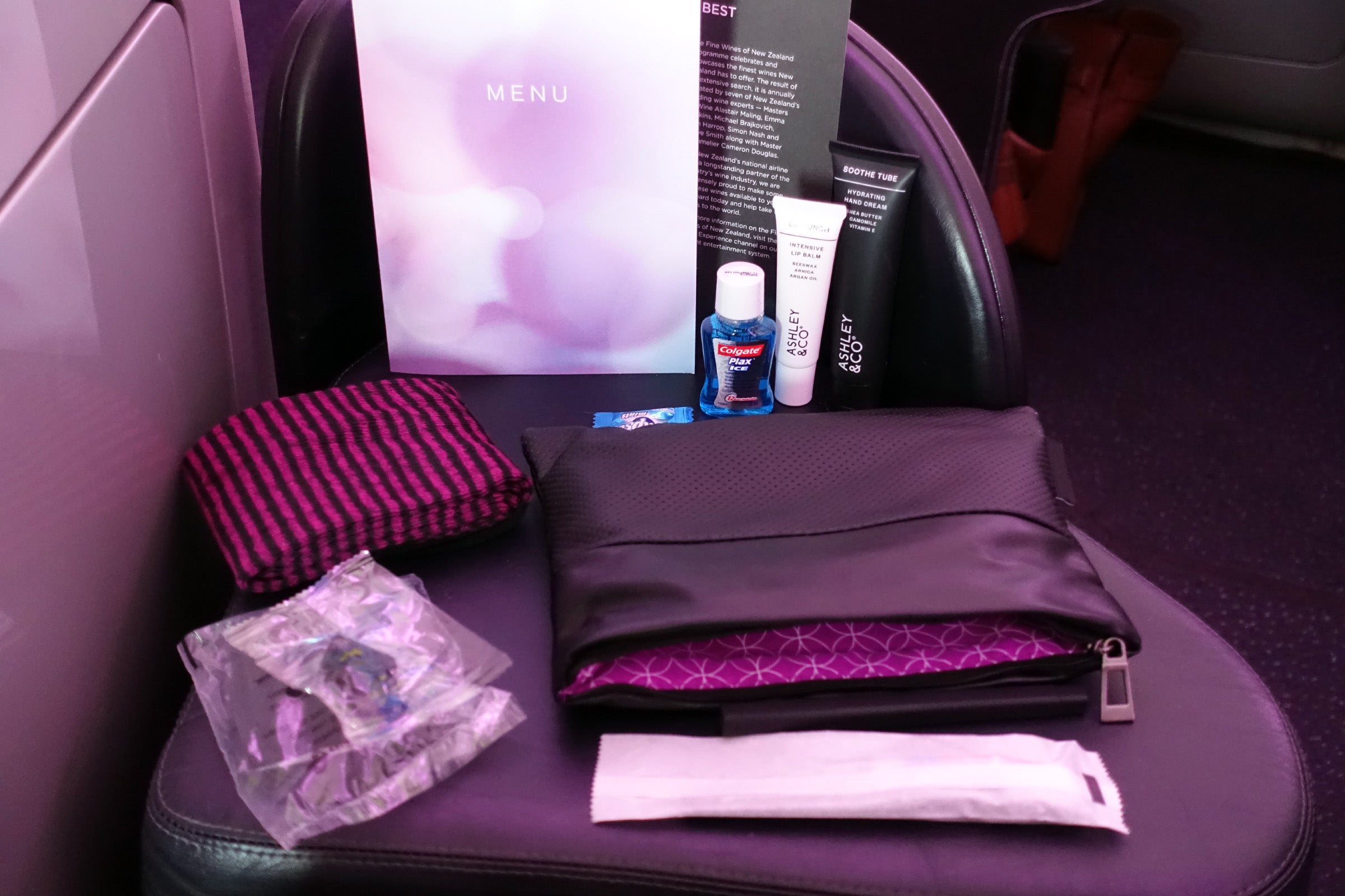 There was an amenity kit waiting at my seat, loaded with the usual suspects, like socks, an eye mask, ear plugs, dental kit, mouthwash, creams and a mint.