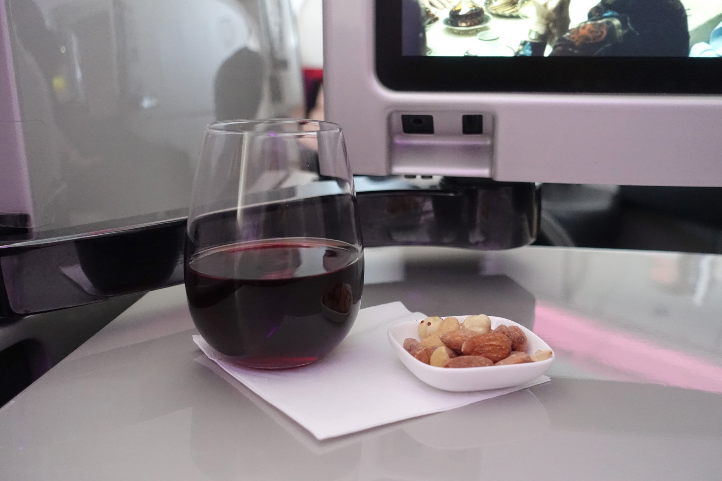 A while after takeoff I was offered another beverage, and opted for a glass of wine. There wasn't a list in the menu, and the only one the flight attendant knew was on board was the special of the month — an Auntsfield Single Vineyard Pinot Noir from Marlborough, New Zealand — so that's what I had. I enjoyed it very much and devoured the mixed nuts, given that I was very hungry at that point.