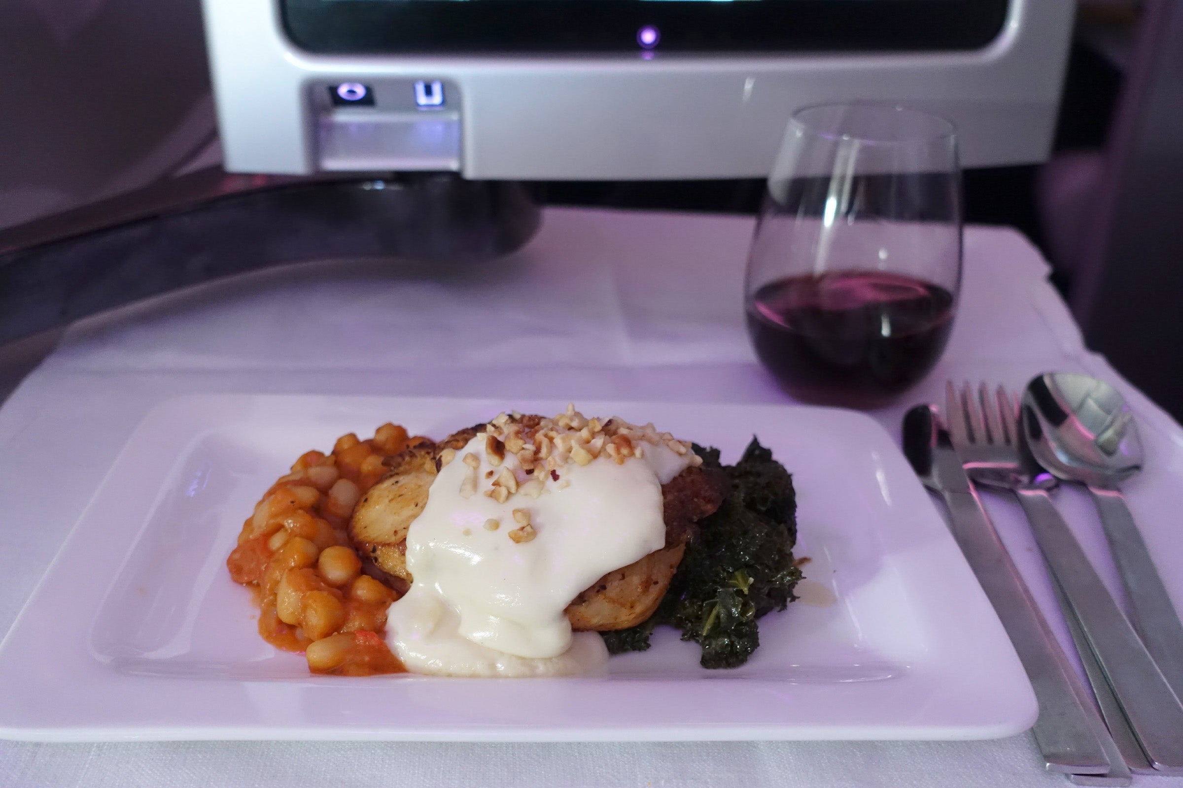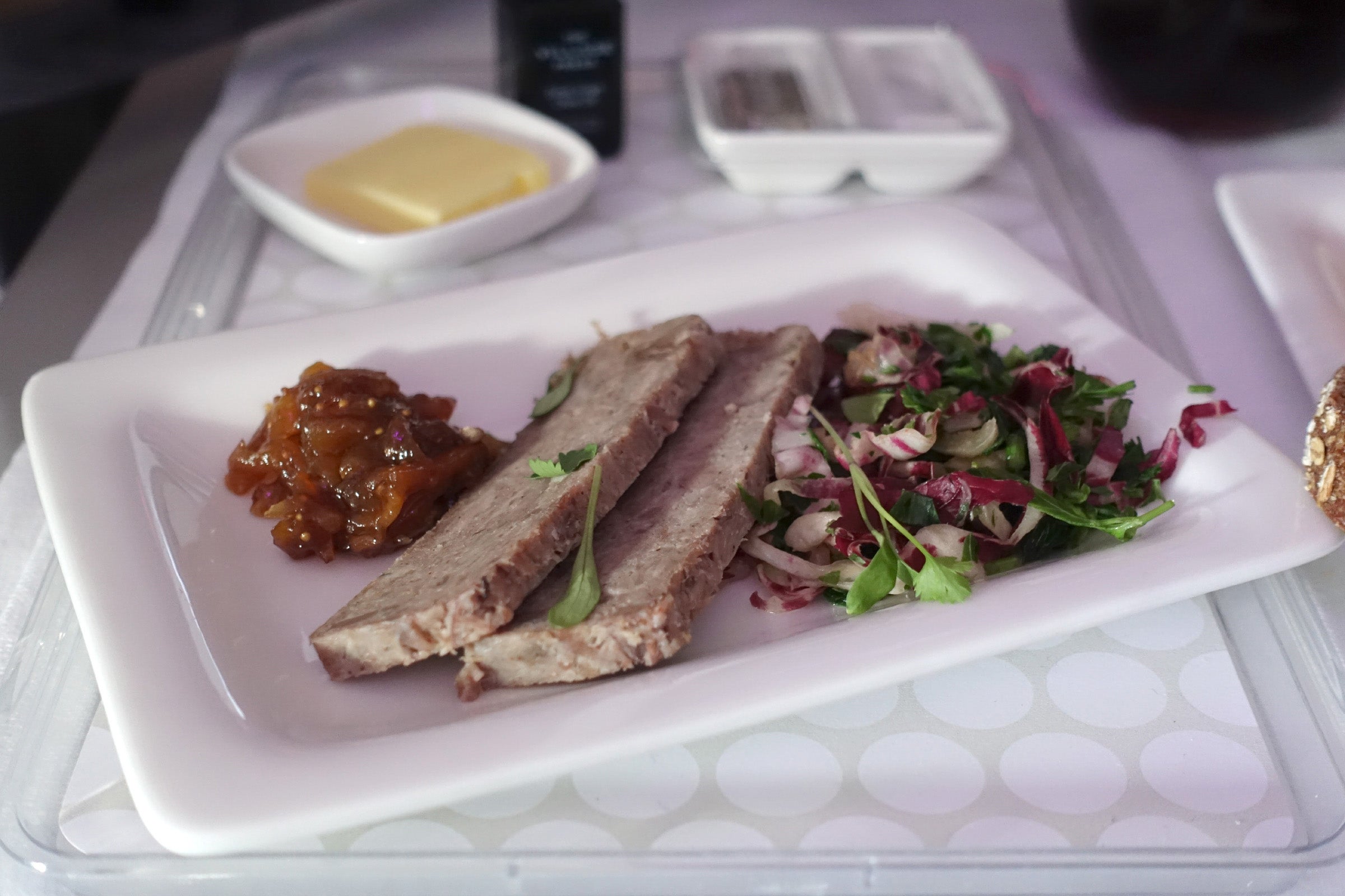There were two starters available: smoked salmon with olives or a chilled duck confit. The flight attendant thought they might be out of the duck but she was able to find one elsewhere in the cabin. It was decent, but I quickly wished I had selected the salmon instead.