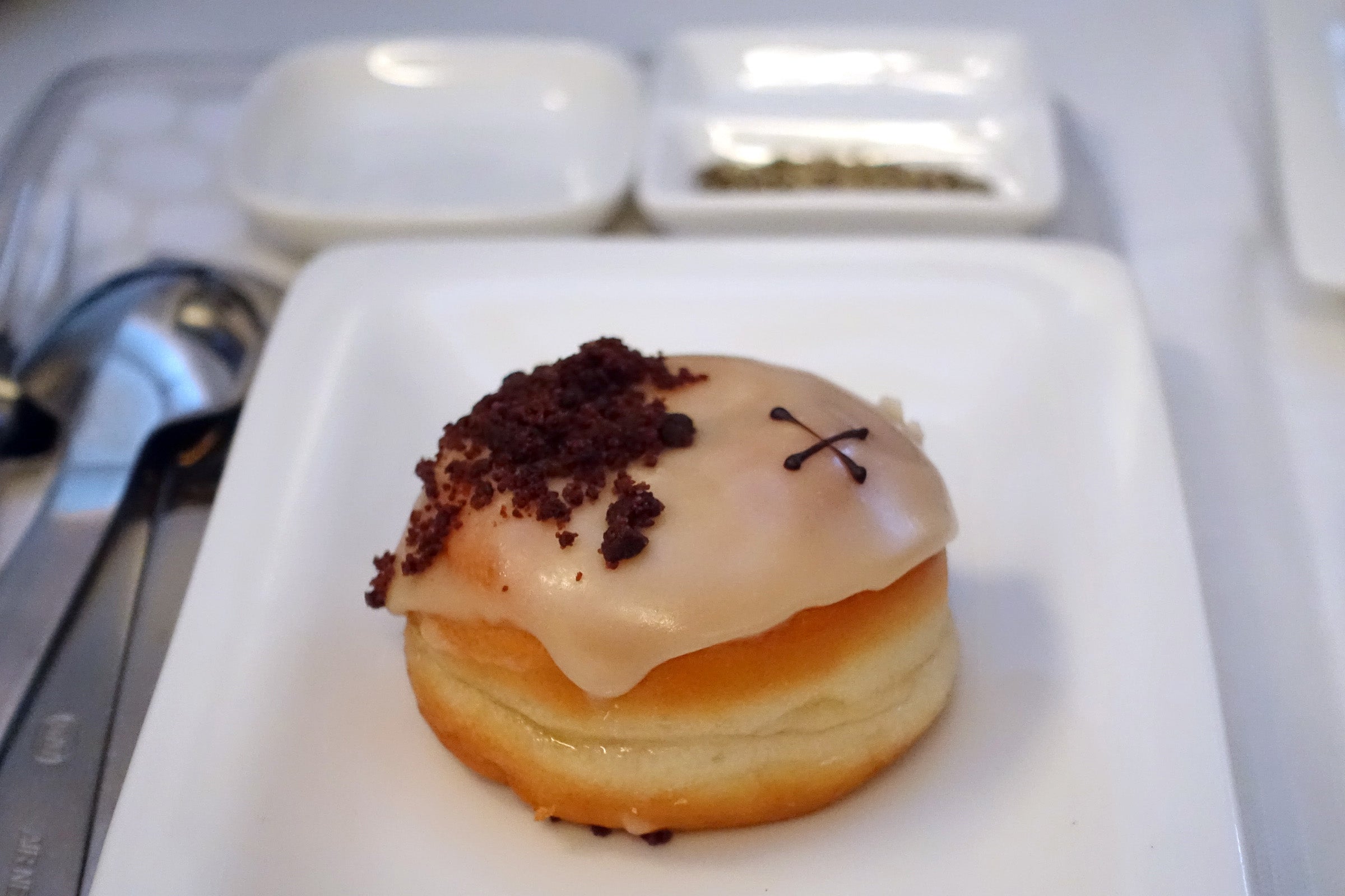 Finally, a flight attendant came through the cabin with a box of donuts (!) — just as Singapore used to do on the nonstops from Newark. I had a choice of dark cherry or custard (or both). The cherry donut really hit the spot and helped end the flight on a high note.