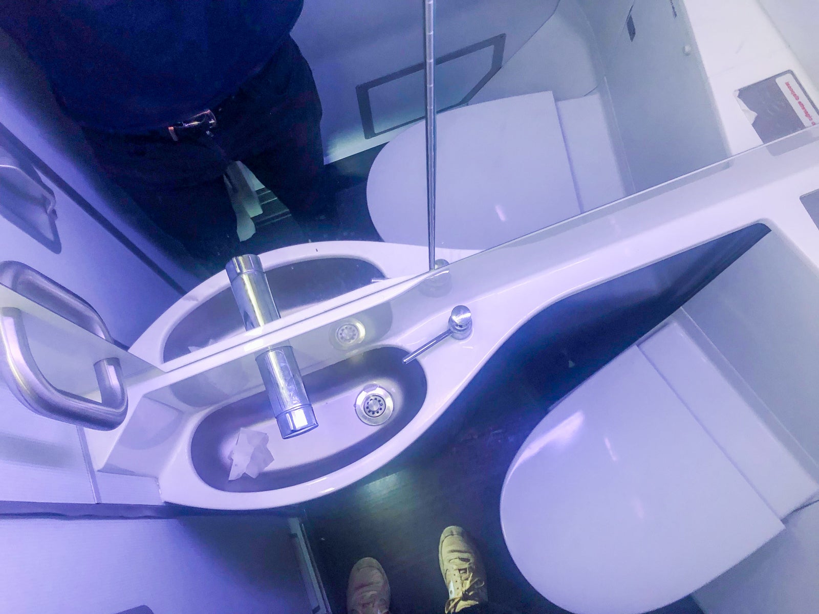 About halfway into the flight, a trip to the lavatory revealed a rather standard, albeit clean, airplane bathroom, with a tiny sink that made spilling water on the floor all but a certainty. But it was clean, and that's what counts!