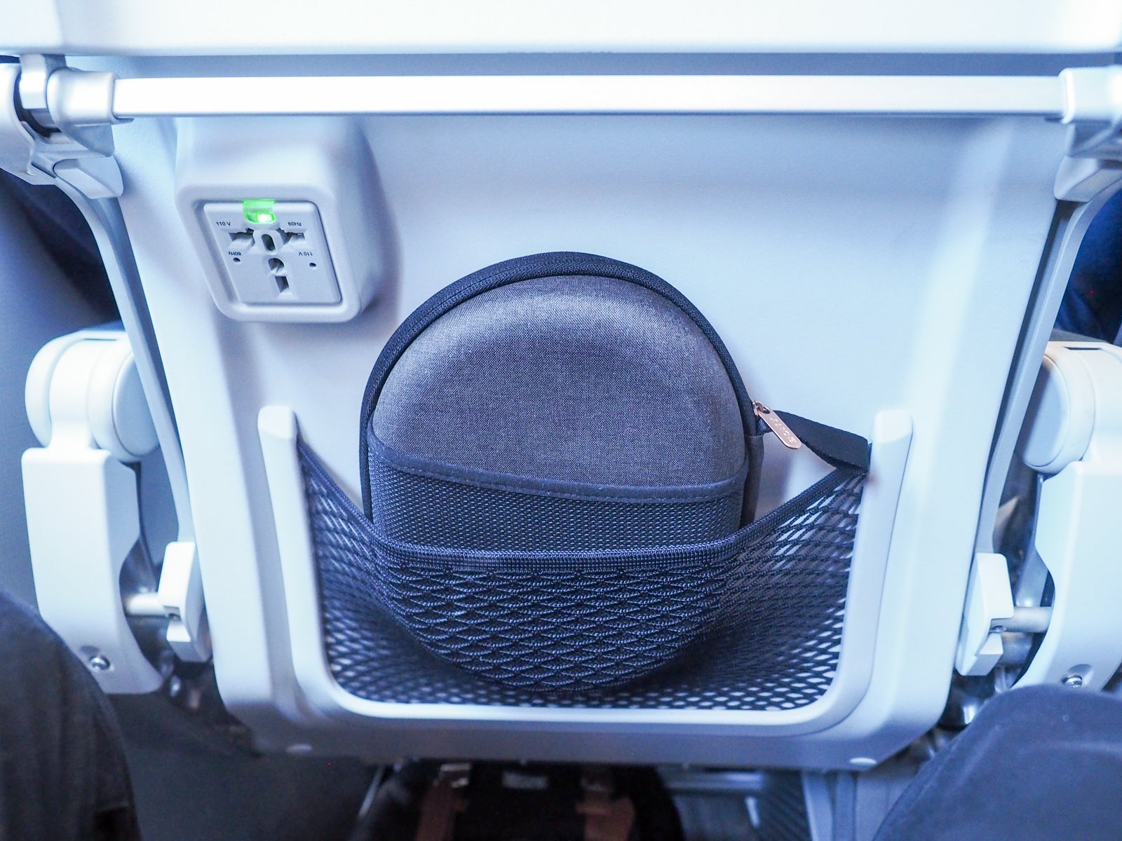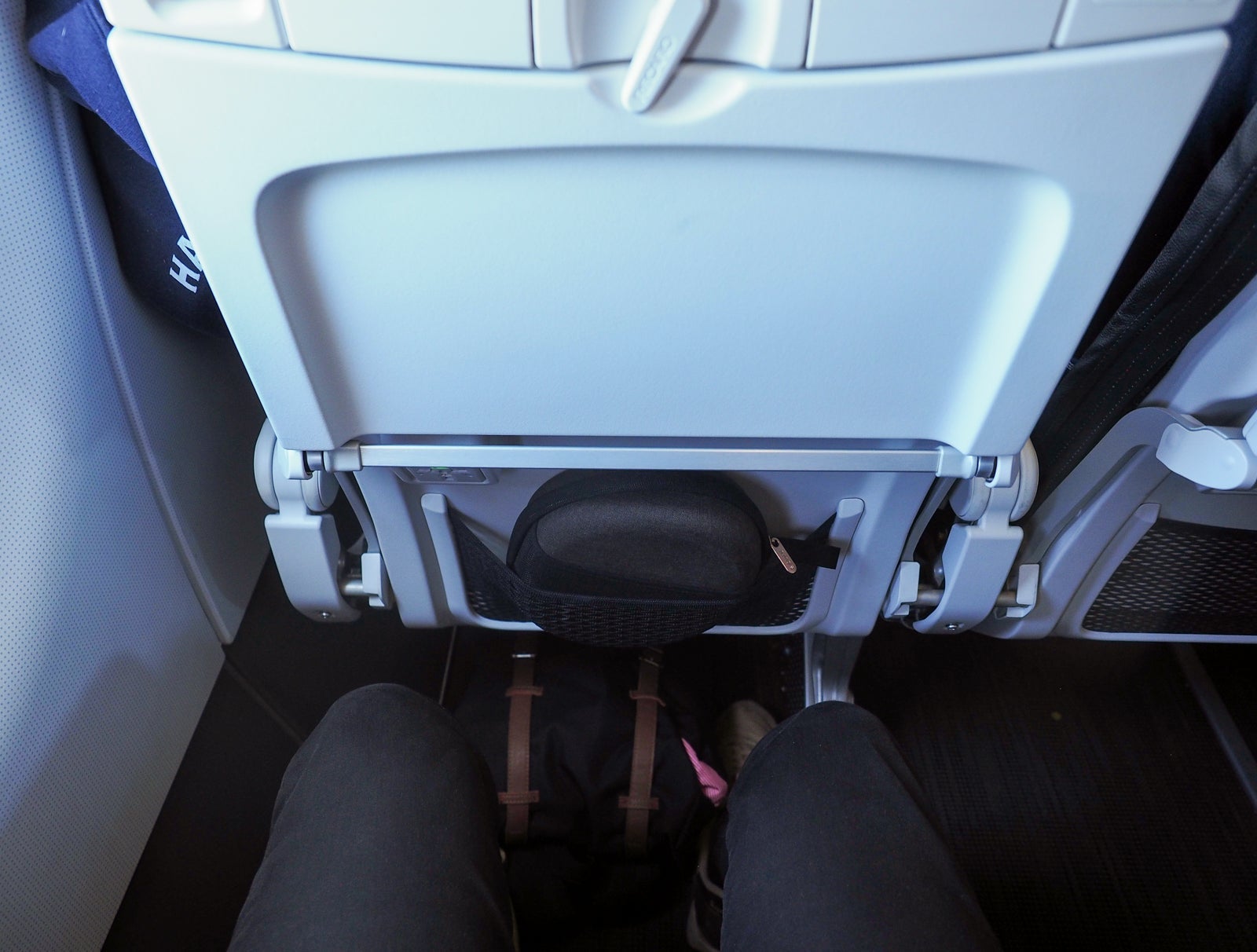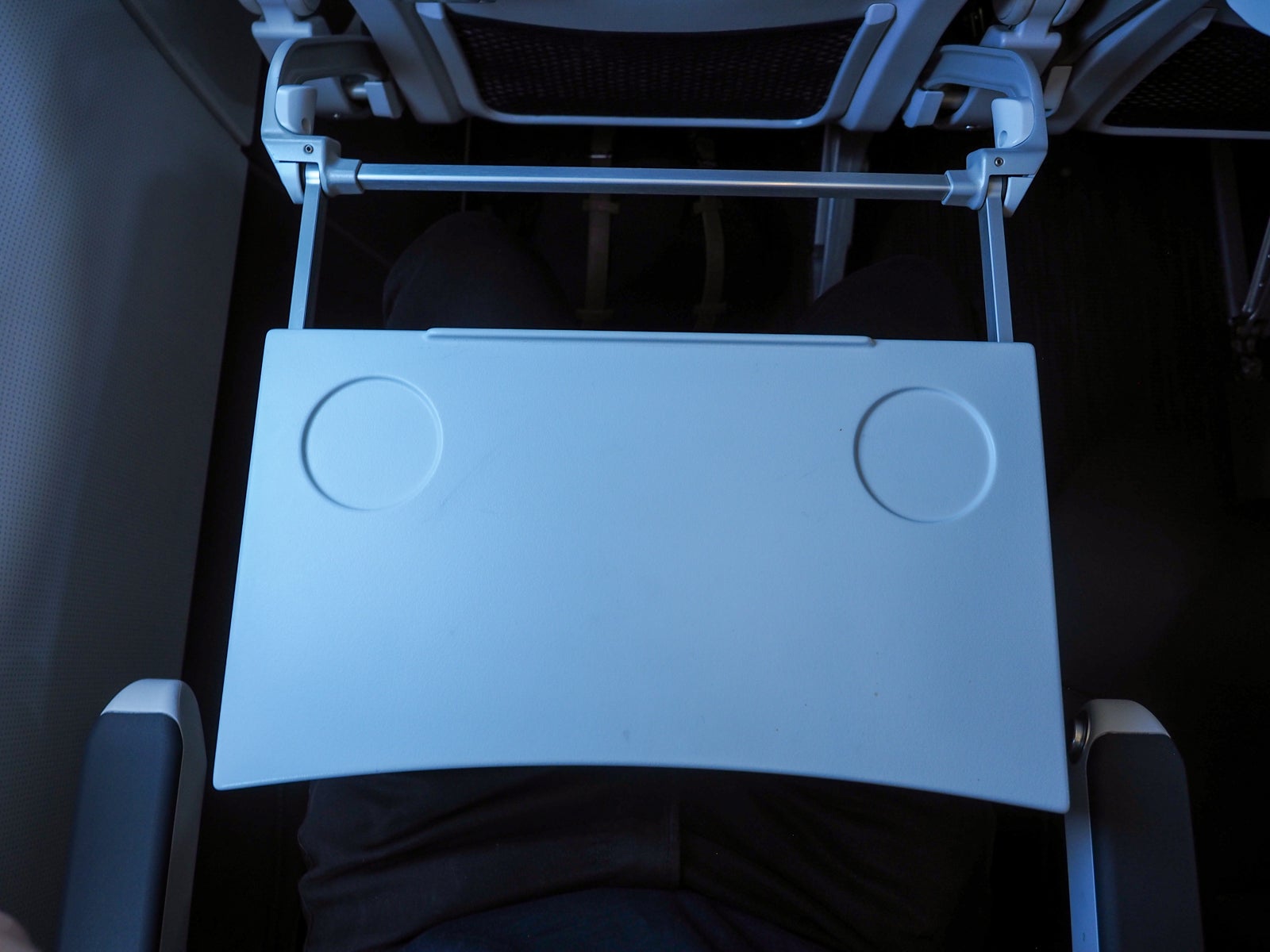 Nevertheless, the small size provided larger-than-normal space — and thus visibility — between the seatback and the table, so I could access a carry-on bag under the seat in front without leaning into a seatmate. Lucky for me, though, I had no seatmate for this flight!