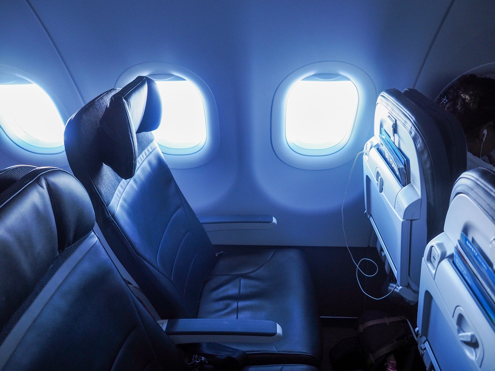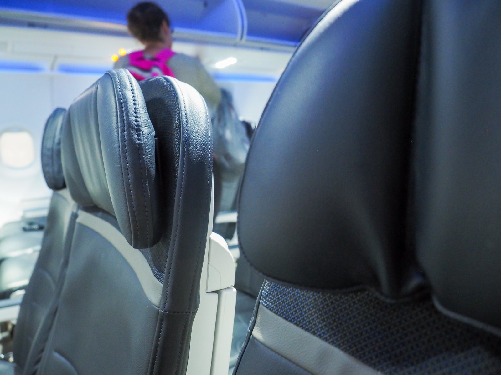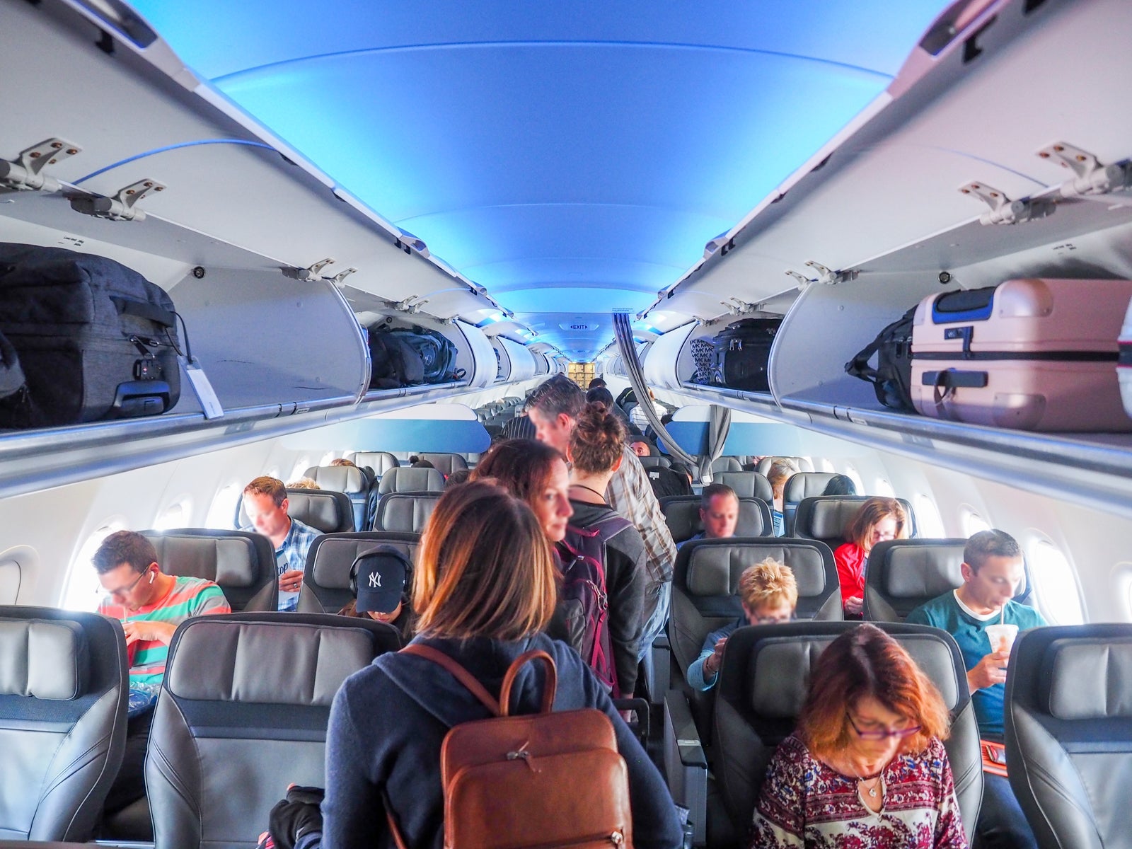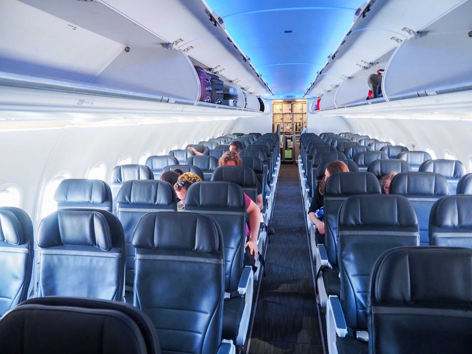 Immediately, it became clear this airplane was new. The seats were clean and plush (at least as plush as domestic economy seats can be), with minimal use. The crew had chosen to use blue mood lighting, a small but nice touch to instill a sense of calm before a flight.