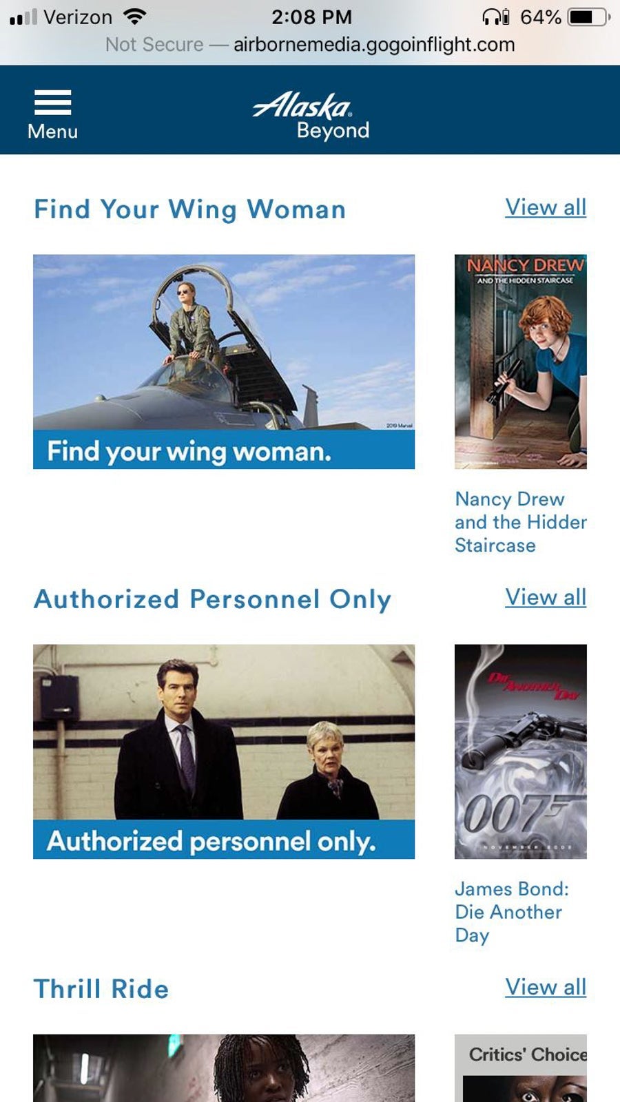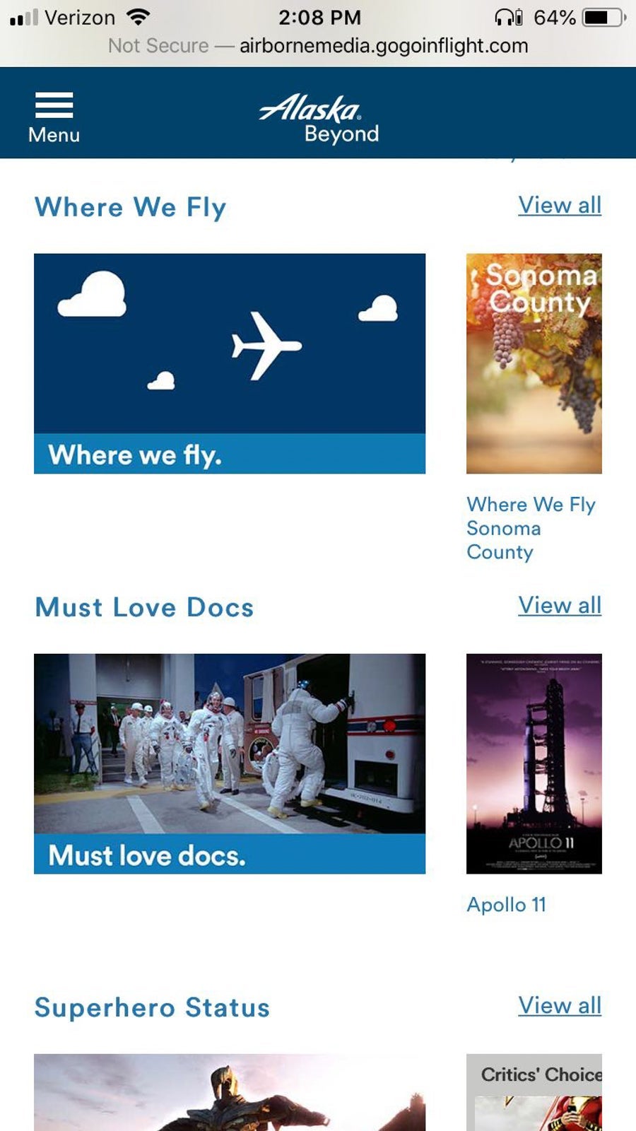 Alaska provides plenty of options for your viewing pleasure. From every Harry Potter film to "Dunkirk," "E.T.," "Fargo," a dozen Bond films, "Life of Pi," a bunch of Marvel films, documentaries like "RBG," "Lord of the Rings" and more, it would be hard to be left unentertained for the five-hour flight.