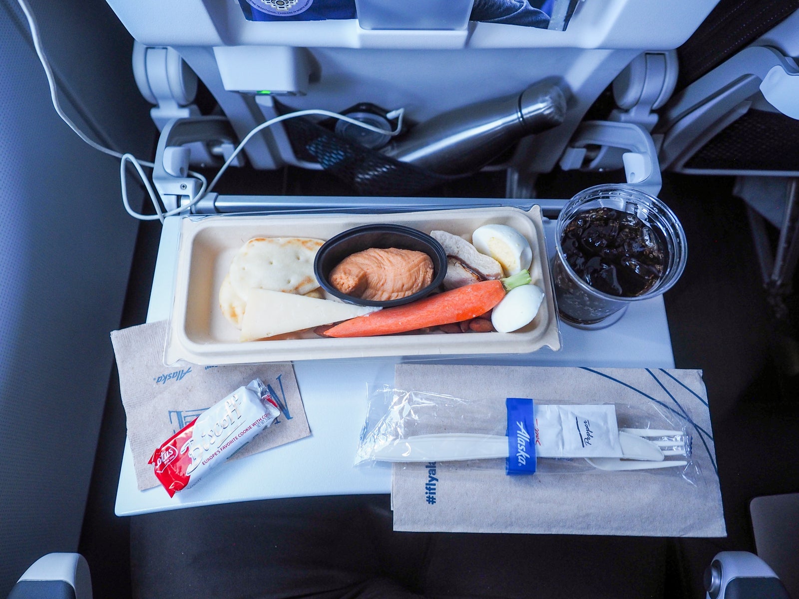 About an hour after takeoff, drink service reached my seat, with complimentary cookies and food for purchase. Curious about food on this route, I asked for a salad. Unfortunately, there were neither salads nor sandwiches left. I opted for the protein platter (consisting of red pepper hummus, pita, cheese, grilled chicken, almonds, cage-free hardboiled egg and carrot), which was $9.50. The Alaska Airlines Visa card earns 20% back on inflight purchases if you choose to make one.