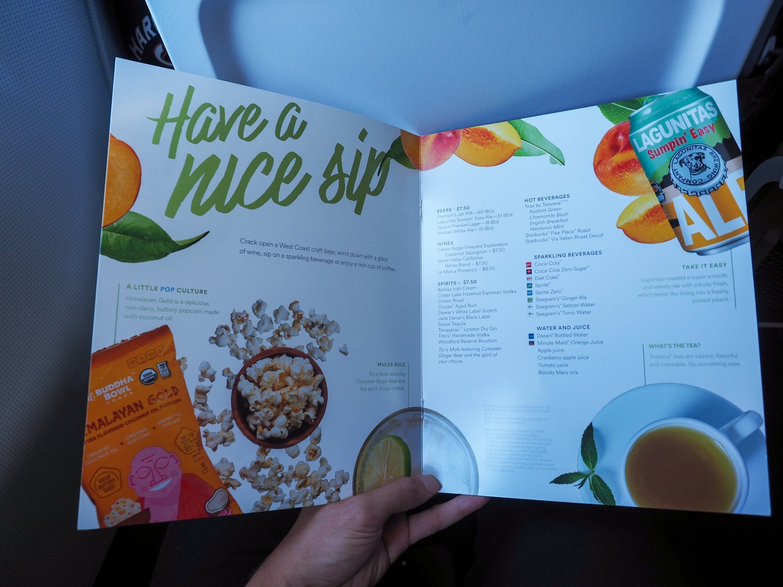 While no meals would be served on this flight (unlike Delta), food was available for purchase. A buy-on-board menu listed options for food offerings, which depend on route, time of day and duration.
