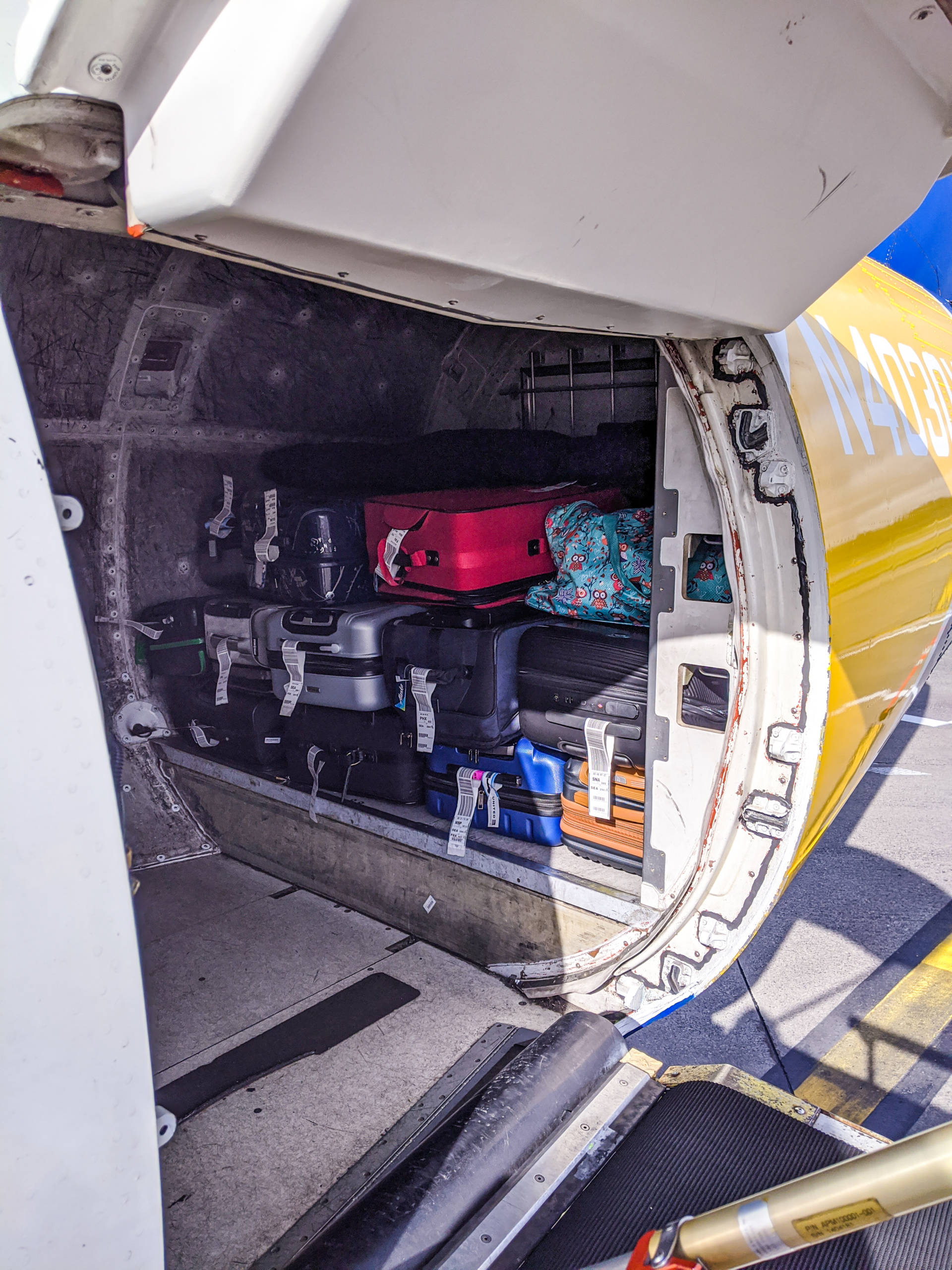 I even snuck a photo of the half-full luggage hold while waiting for the passenger in front of me to step inside the plane. The small luggage hold on the Dash 8 really drives home the importance of packing lightly on small planes.