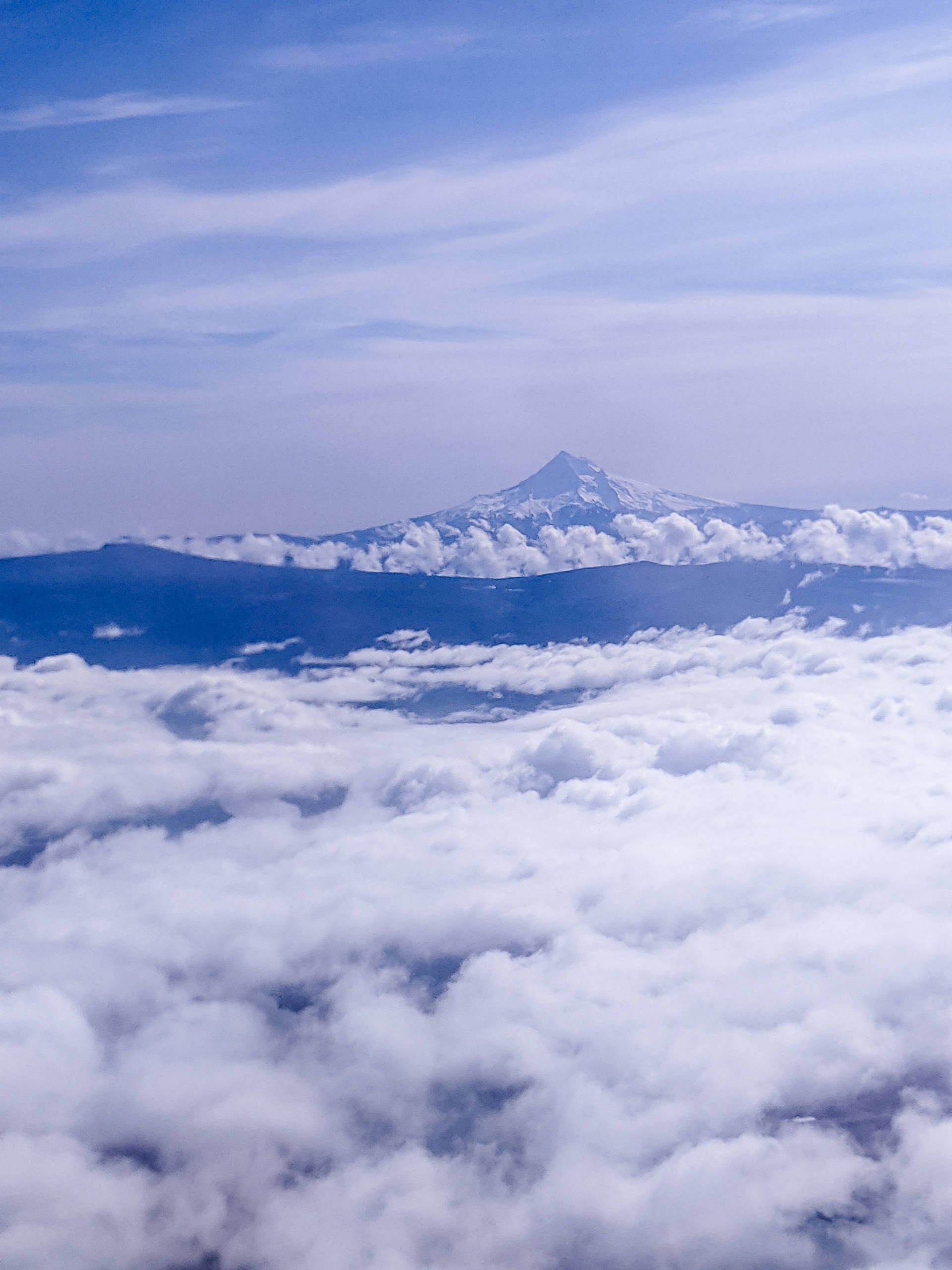 The interior of the plane featured burgundy leather seats with greige accents. The seating felt small but surprisingly comfortable regardless. The short flight meant that service was limited to a quick drink; I don't remember if I was offered a snack, but I had my Capers Cafe scramble to munch on, so I didn't need anything by way of sustenance for our brief time in the air. On a flight from Portland to Seattle, a seat on the right side often results in great view of the Cascade volcanoes, like 11,249-ft Mount Hood.