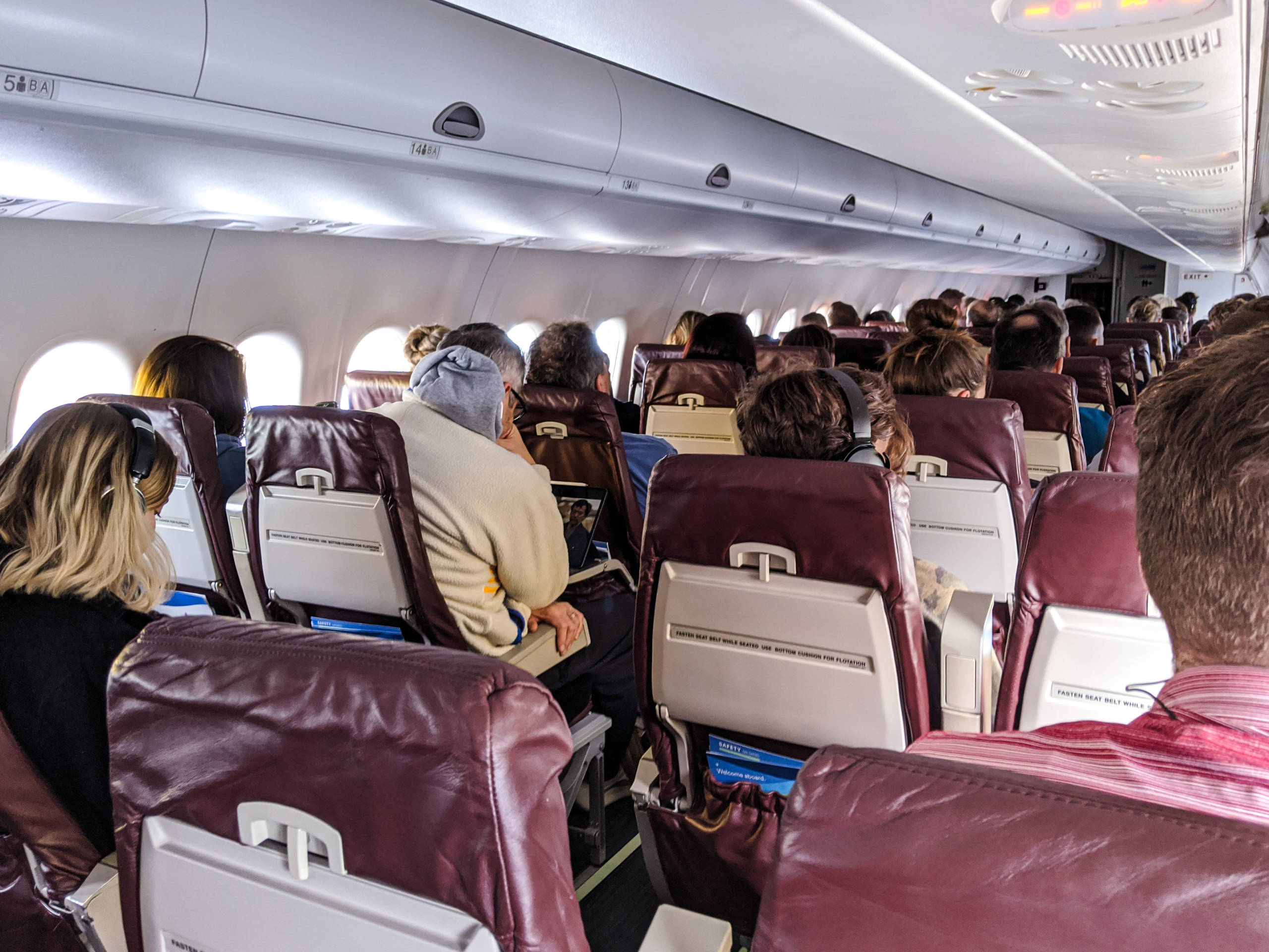 On board, all 76 seats are in a single class in a 2-2 layout. There is no first class, only four seats with extra legroom at the front of the plane. Legroom at most seats is 31 inches, with 17-inch width, within the coach-class average. In this regard there is no difference between a turboprop and the average jet, but note the lack of window shades.