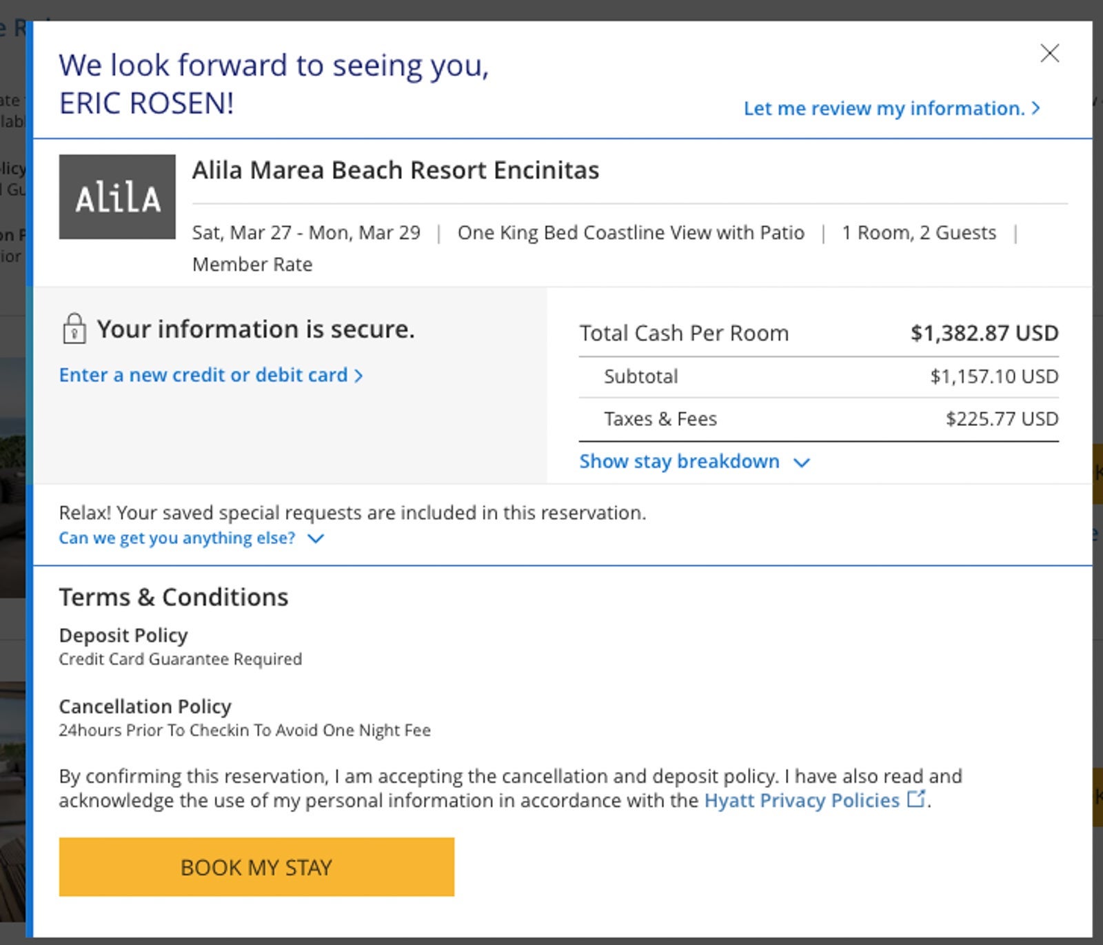 Even more so because I already had 44,000 Hyatt points in my account as a 25% refund from a summer stay at Alila Ventana Big Sur due to the World of Hyatt Bonus Journeys promotion. I simply transferred another 6,000 points from the Ultimate Rewards account linked to my Chase Sapphire Reserve and booked a standard King Bed Coastline View With Balcony room for two nights.