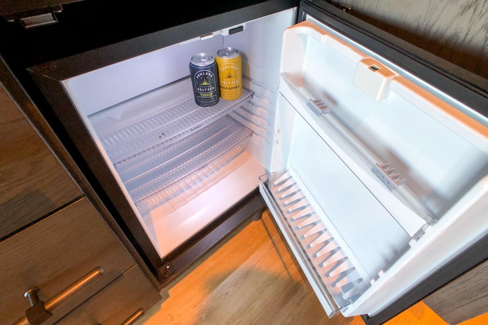 The wall opposite the bed held a 65-inch television and a set of drawers for clothes as well as a minifridge with two complimentary bottles of Proud Source water, and two canned cocktails from San Diego-based Ashland Hard Seltzer.