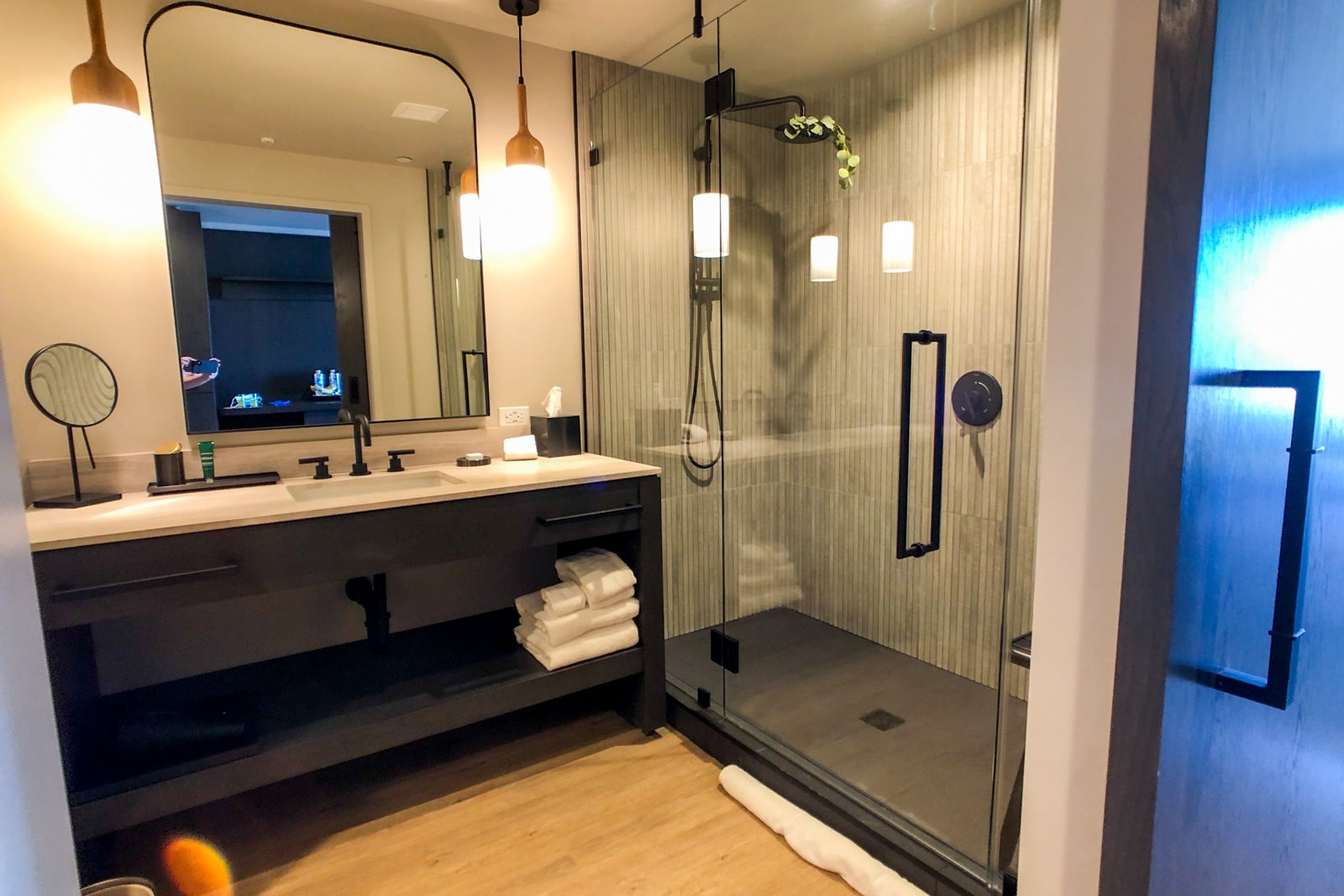 Given San Diego's drought-stricken past, it's no wonder there's no bathtub in the room. But the spacious, glassed-in shower more than made up for that. And the wall-mounted showerhead was festooned with a eucalyptus sprig to provide a whiff of aromatherapy.