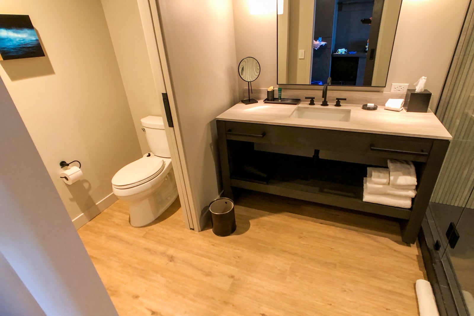 The bathroom wasn't bad, either, though. Sealed off from the main room by a sliding door, it contained just a single sink, but plenty of counter space.