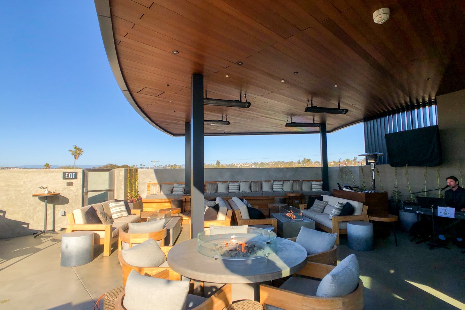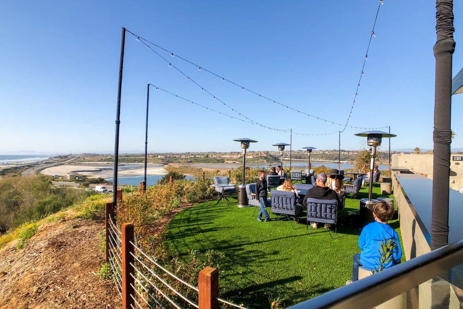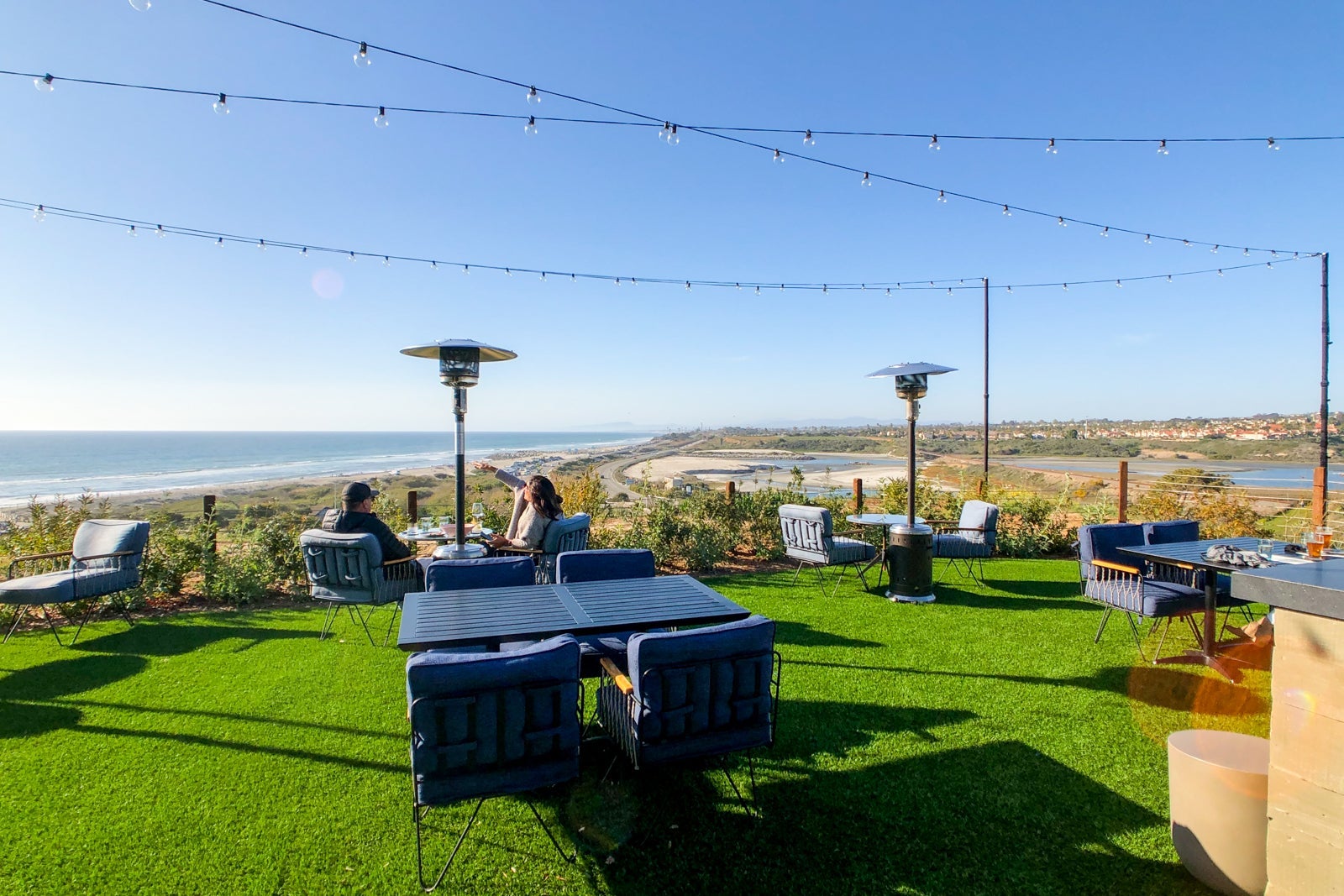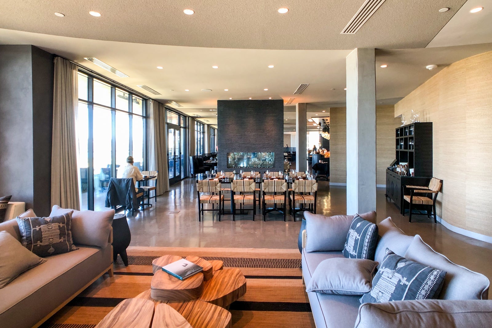 Private outdoor tables were arranged along a wide balcony overlooking the ocean. The outdoor bar and lounge had great views of the coast, plus fire elements to keep visitors warm when things cool off in the evening. We asked for an outdoor table to help us socially distance from other guests, and were quite comfortable under the heating lamps.