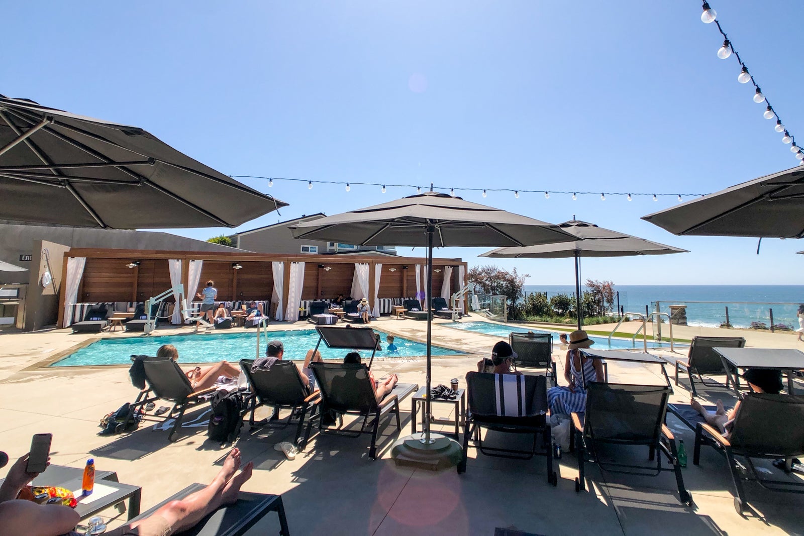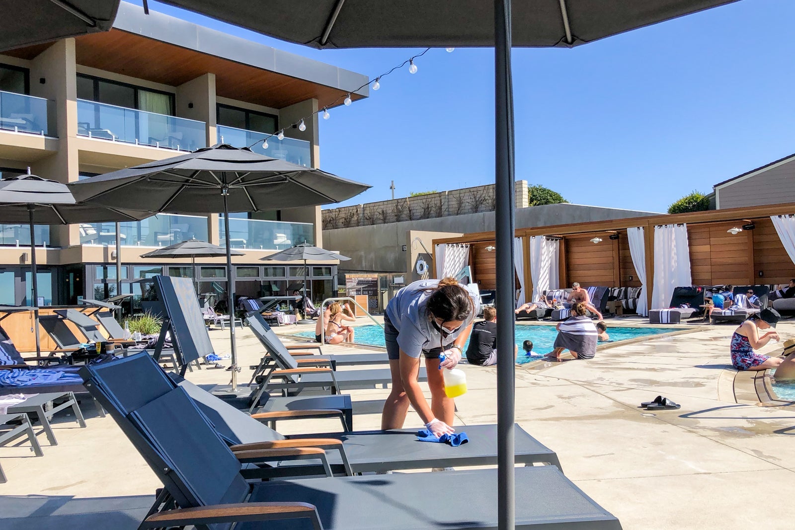 The pool area was located at the end of the building closest to the ocean, and contained both a small main pool and a hot tub just in front of the pathway to the beach. There were plenty of lounge chairs available on a first-come, first-served basis. They were grouped in pairs and spaced 6 feet apart. The pool staff disinfected them between guests and adjusted the umbrellas up or down depending on your shade preference.