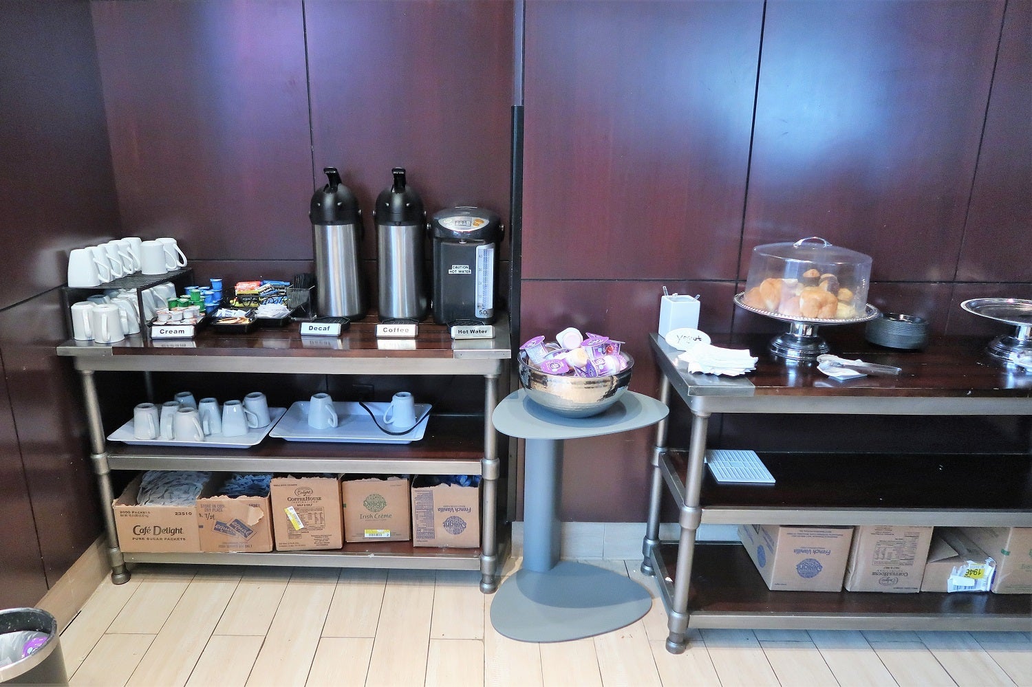 At breakfast time, there were two food options: a prepackaged pastry or a small yogurt cup. The drink options were limited as well, consisting of apple juice, orange juice, filter coffee and mixer drinks. Check-in to the lounge took about five minutes because of technical difficulties, and when we left there was a long line of people waiting. Stopping by this temporary lounge wasn't worth going out of our way — it was small and had limited food, drinks and seating.