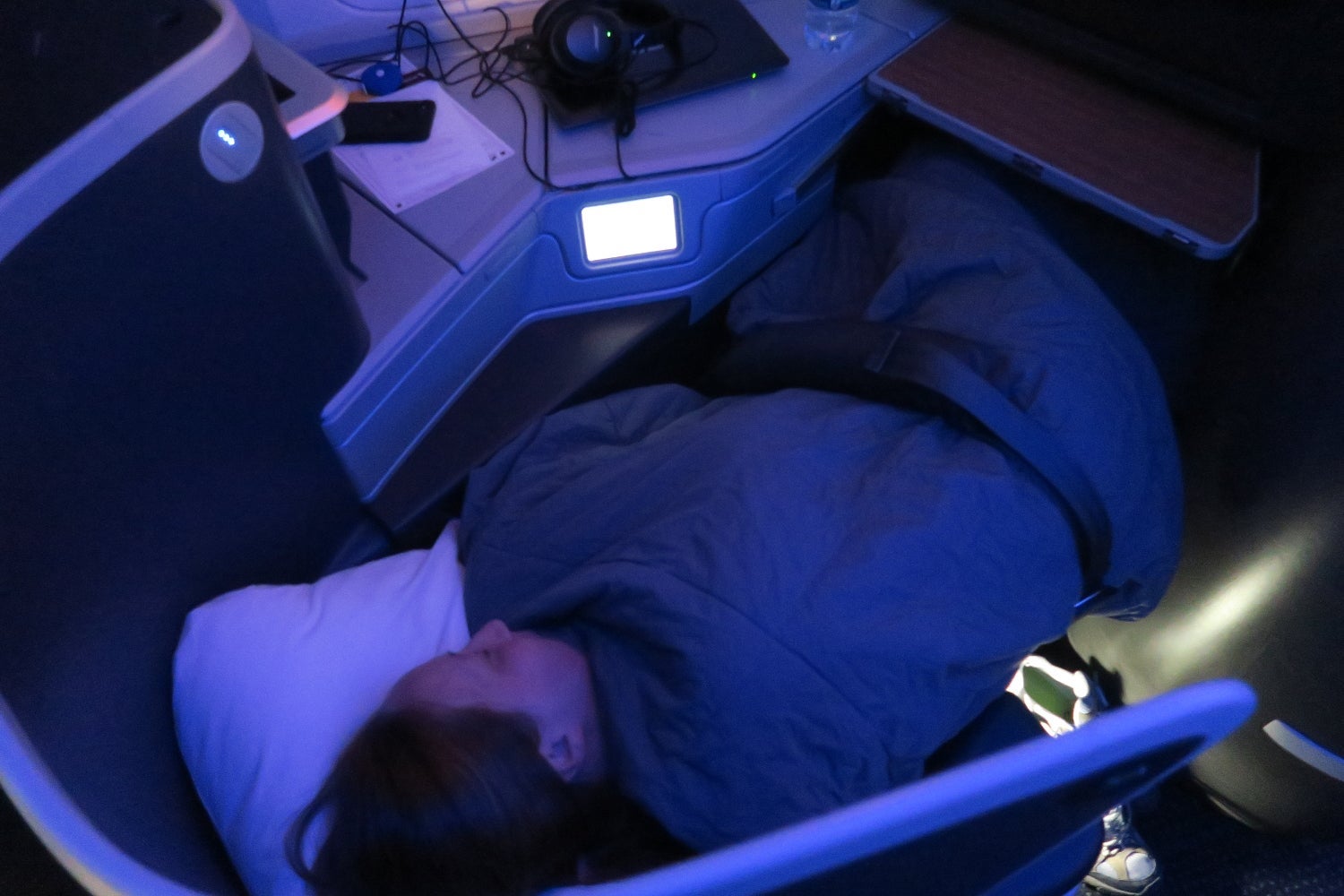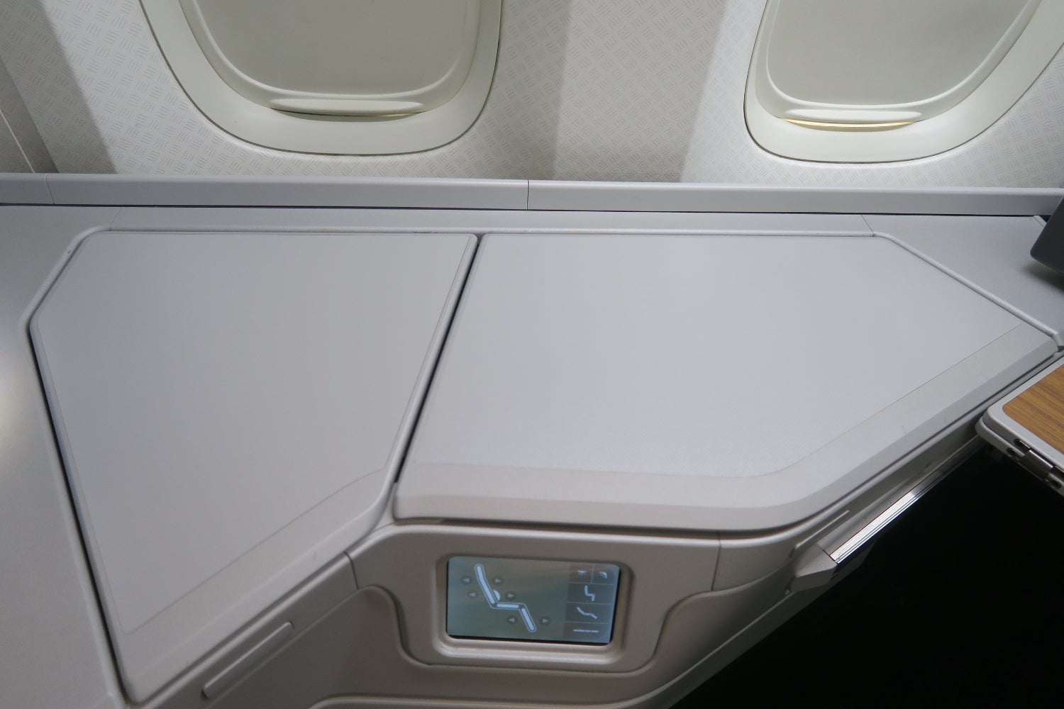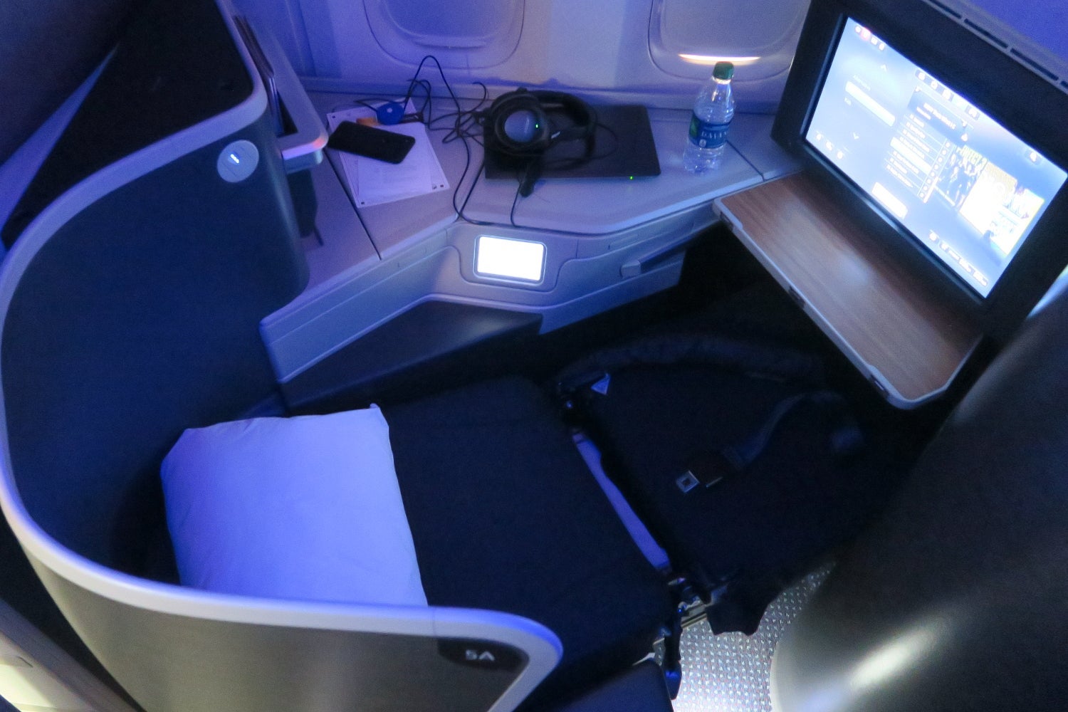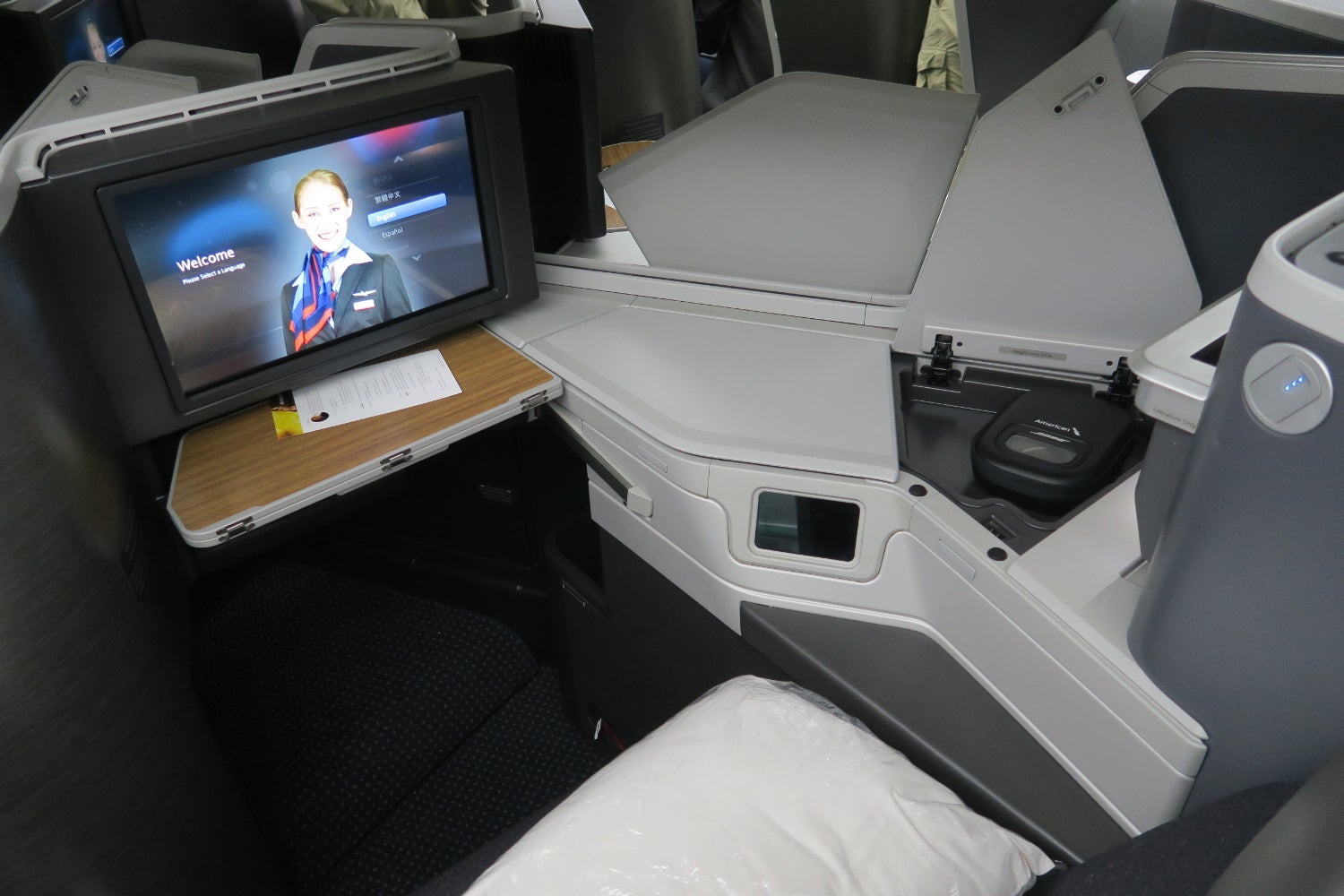 Besides the large gap, the bed was relatively comfortable when flat. However, as a side sleeper, I found the decreasing width — to about 19 inches wide in the knee area — uncomfortable. Plus, the table didn't fold away and instead sat below the IFE screen. This meant that if you turned or moved your knees while sleeping on your side, you'd wake when your knees slammed into the table. For this reason, I prefer American's 777-300 reverse-herringbone seat over this one as the best premium seat on American.