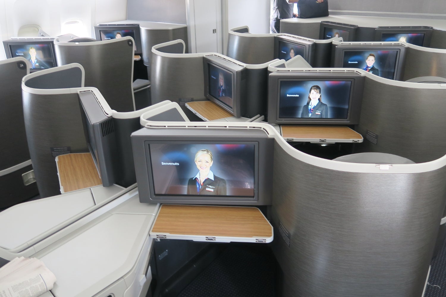 We lucked out on this flight and got B/E Aerospace seats — one of American's best business-class products. The business-class cabin had 10 rows of 1-2-1 seating with the sixth row only containing one window seat. The first six rows were in a front cabin, while rows 7 through 10 were in a rear minicabin. Two lavatories and the primary business-class galley were between the two cabins. There was also a lavatory at the front of the aircraft.