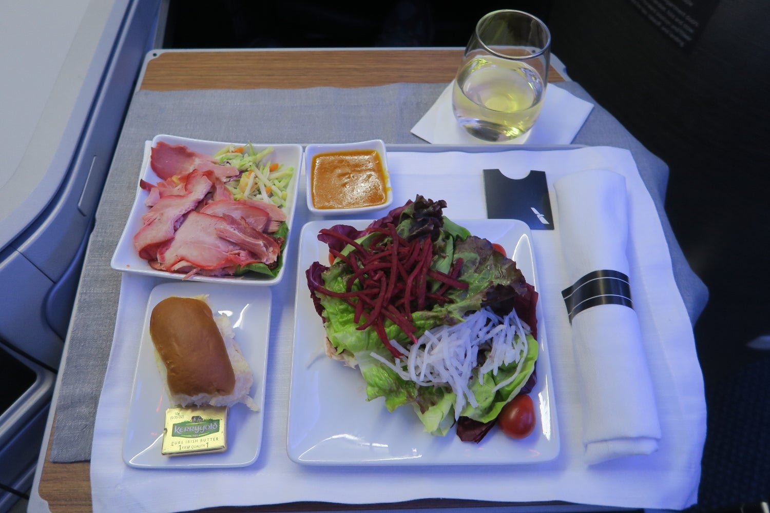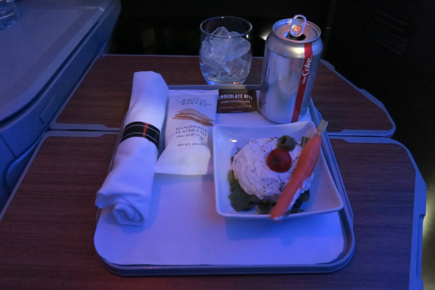 The arrival meal was served an hour and 37 minutes before landing. We could choose tomato-basil cream cheese dip, cherry tomato, olive and arugula, or fresh grapes and a selection of fine cheeses.