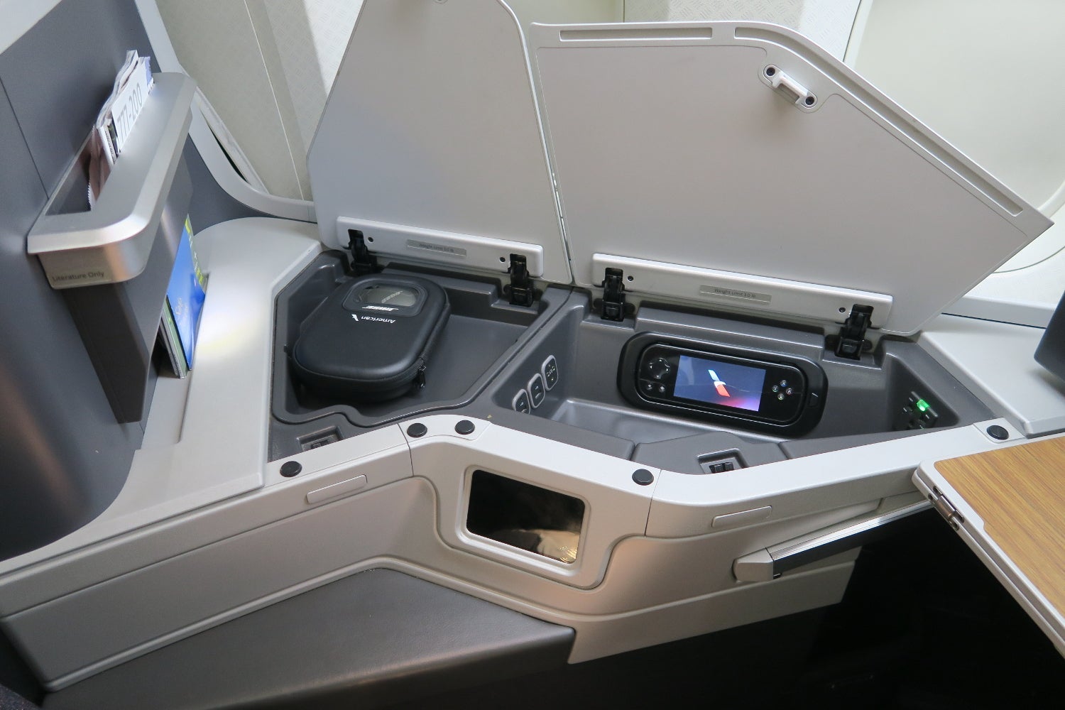 American's 777-200 with B/E Aerospace Super Diamond seats is one of my favorite American business-class hard products for daytime flights because of the significant table and counterspace at each seat. However, the large gap in some seats can be uncomfortable and, as a side sleeper, the tray table on this seat frustrates me on flights where I need to sleep.
