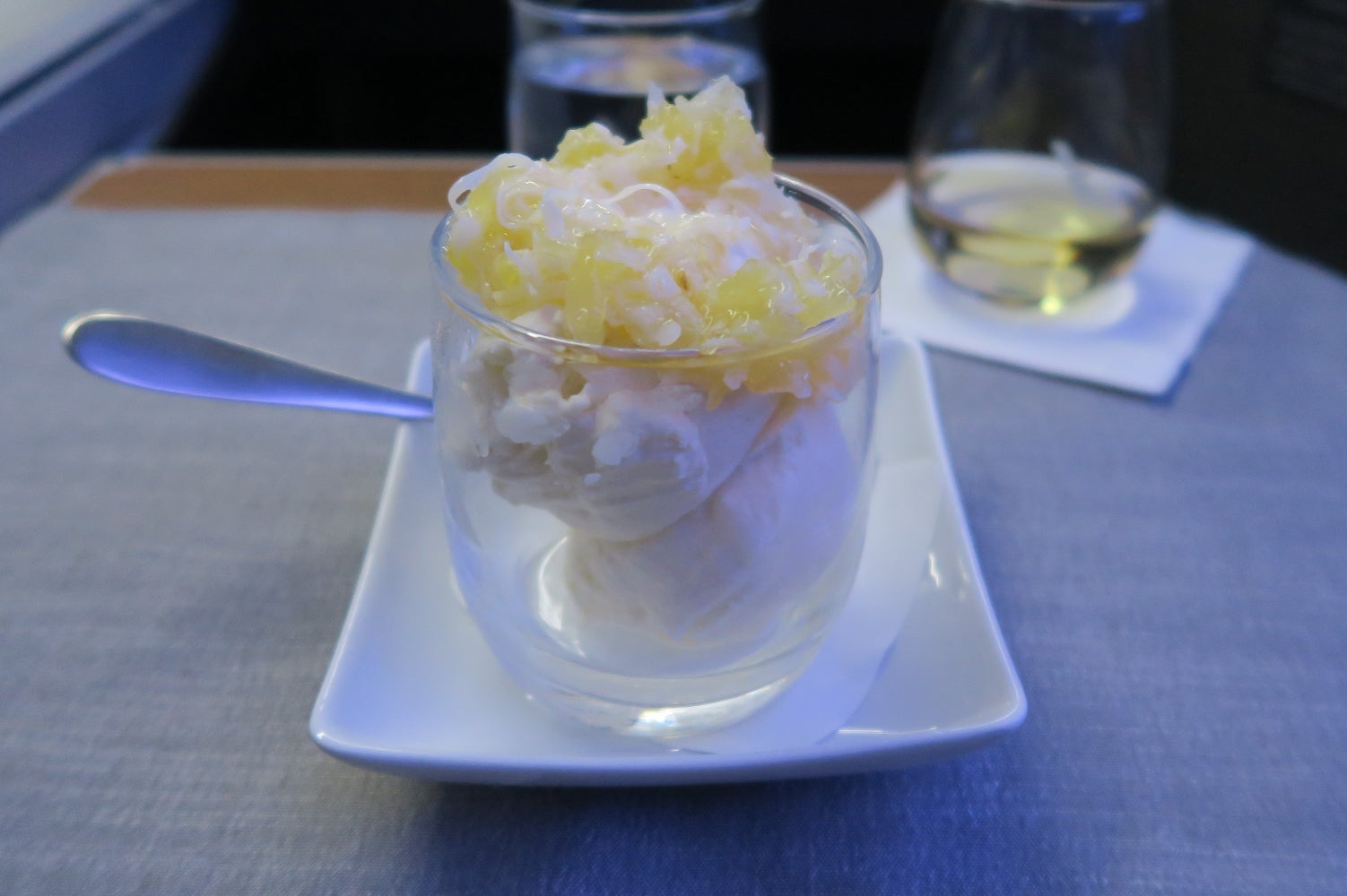 Dessert was a choice of AA's signature ice cream sundae or a fruit-and-cheese plate. I opted for the sundae with pineapple-coconut compote and whipped cream — it was decadent, and I appreciated the Hawaiian-themed pineapple-coconut compote.