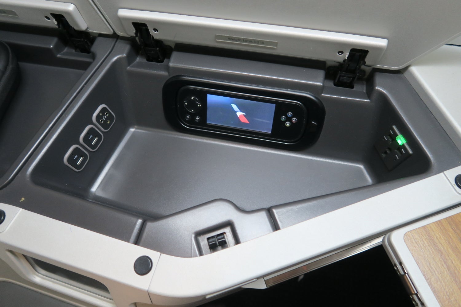 The other compartment was about 4 inches deep and contained two USB outlets, one universal power outlet and a remote for the IFE. This compartment is also where the headphone jack was.