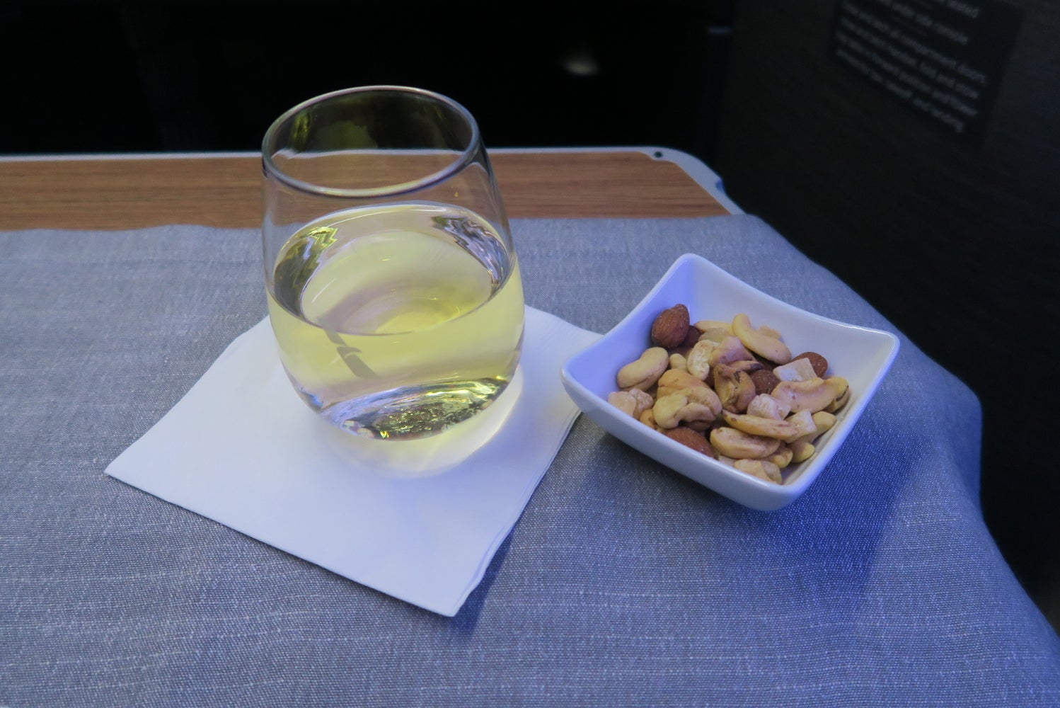 Tablecloths were set 20 minutes after takeoff, and bottles of cold water were distributed a few minutes later. Drinks and cold nuts with pineapple bits and coconut flakes were served 35 minutes after takeoff. Although I prefer warm nuts, I did appreciate the Hawaiian-themed nut mixture.