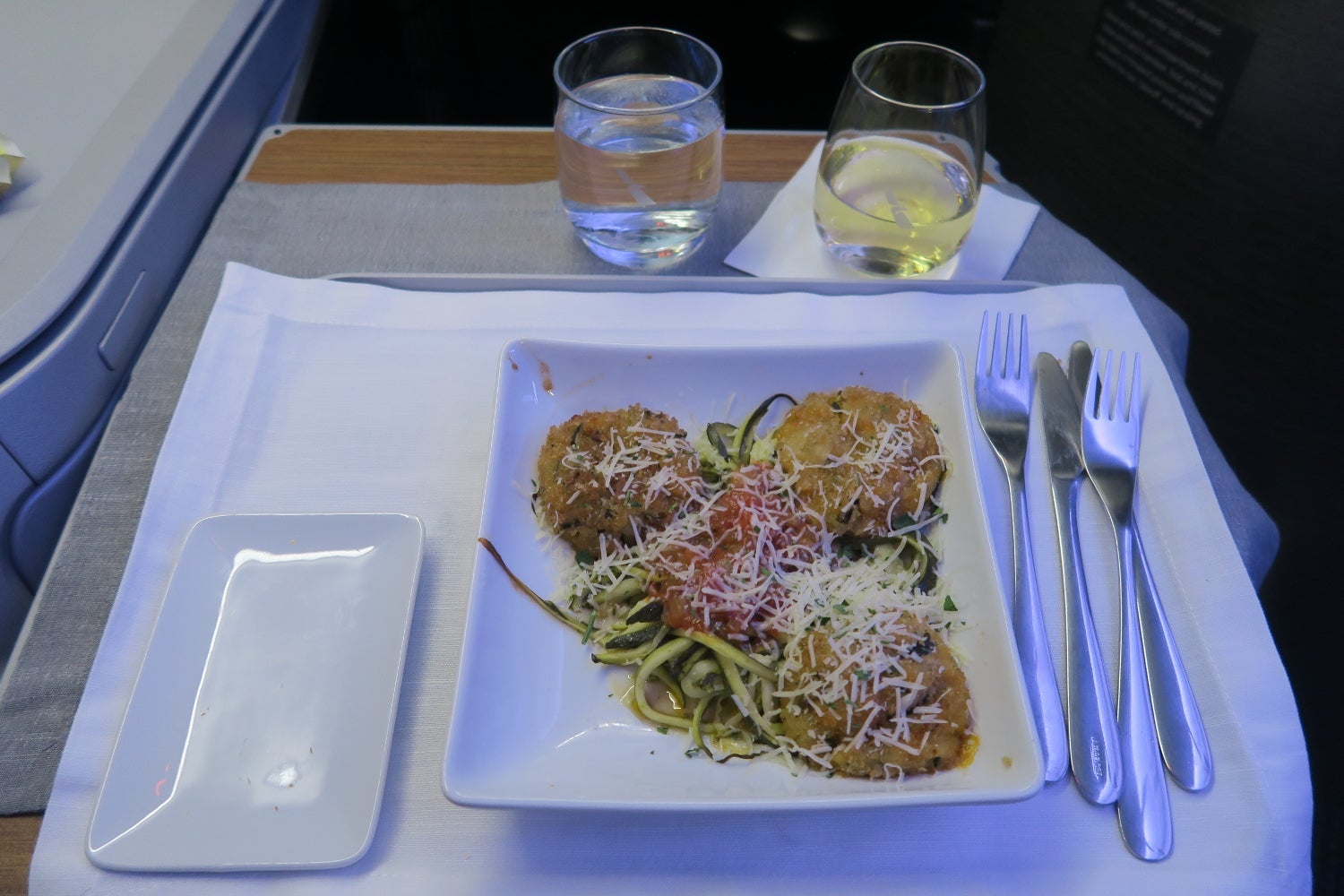 The vegetarian meatballs were excellent — they featured crisp breading and were tasty on the inside. The spaghetti was cooked perfectly, and the pesto added the perfect flavor. Despite not looking like much, this is likely the best AA business-class entrée I've eaten.