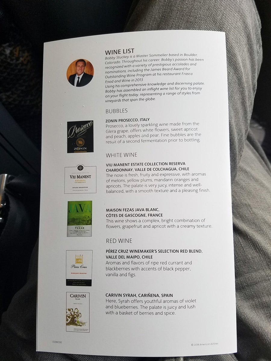 The wine list was a pretty standard affair: two whites, two reds, one sparkling (prosecco, a popular choice in 2018 — last year, the best-selling sparkling wine in Italy crushed the competition with 23% sales growth in the US, triple the rate for French Champagne.) But, hey, American Airlines — not one wine from the US, and on a domestic flight from a great winemaking region, too?