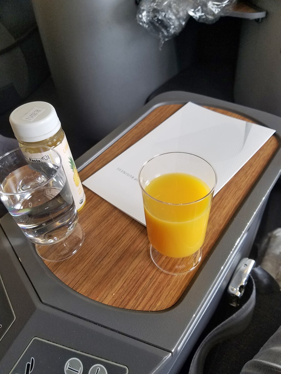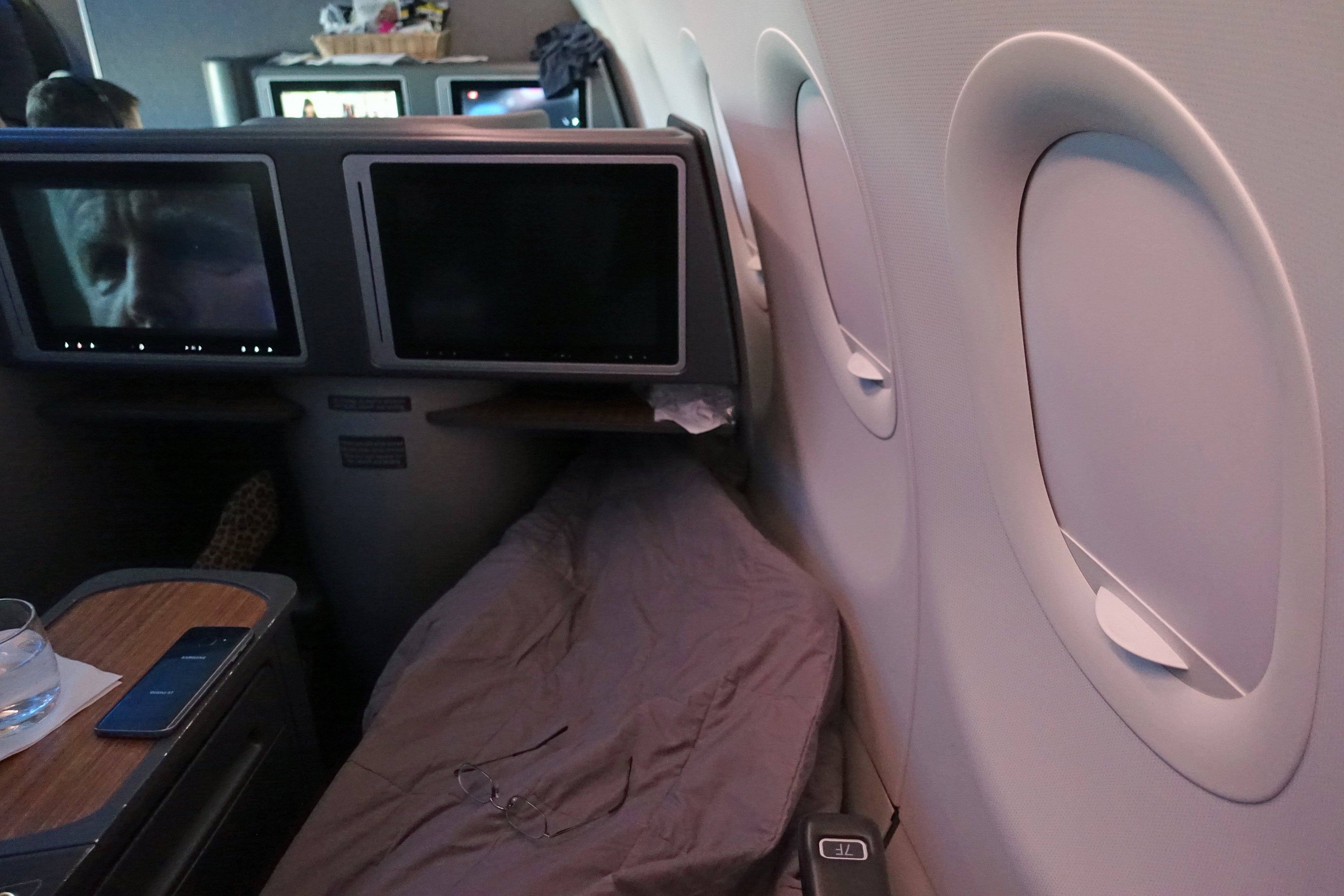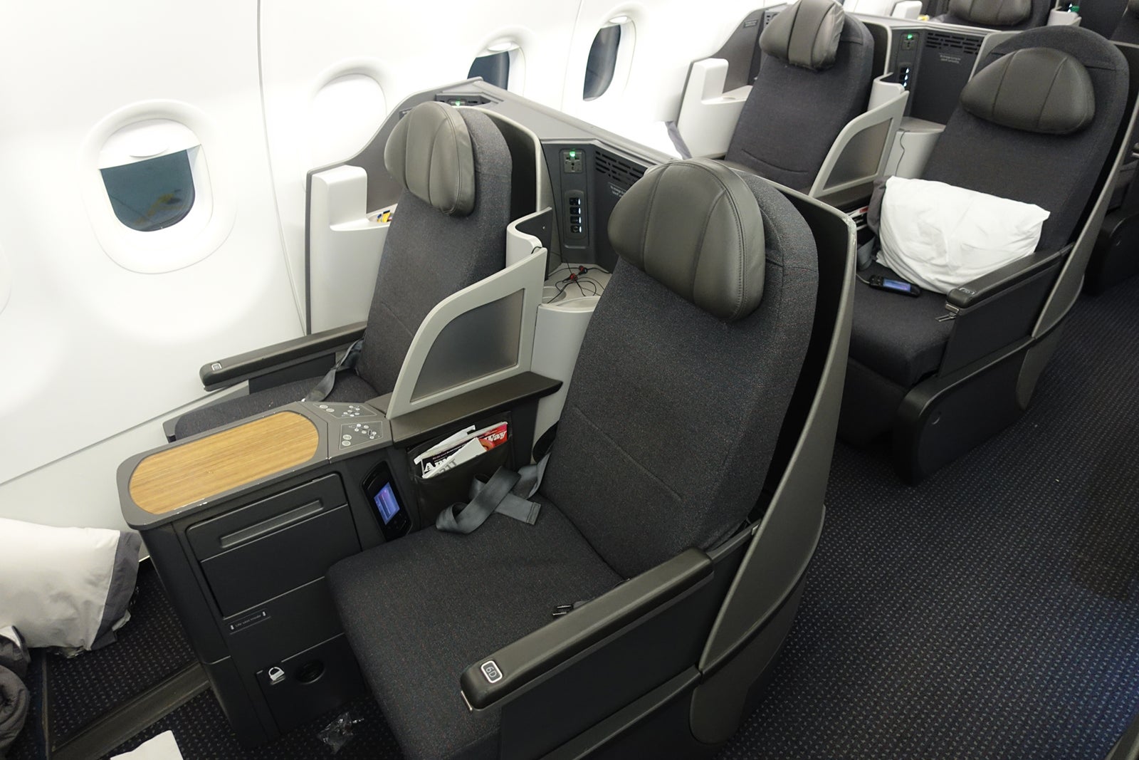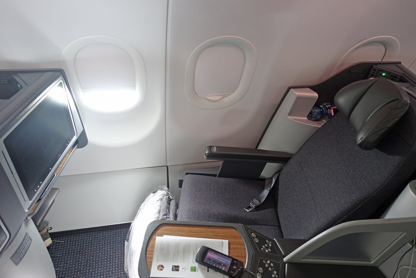 At 7F, I was pretty close to my seatmate. The cabin looked very similar to biz class on American's Boeing 757s, but with an actual monitor for inflight entertainment instead of tablets.