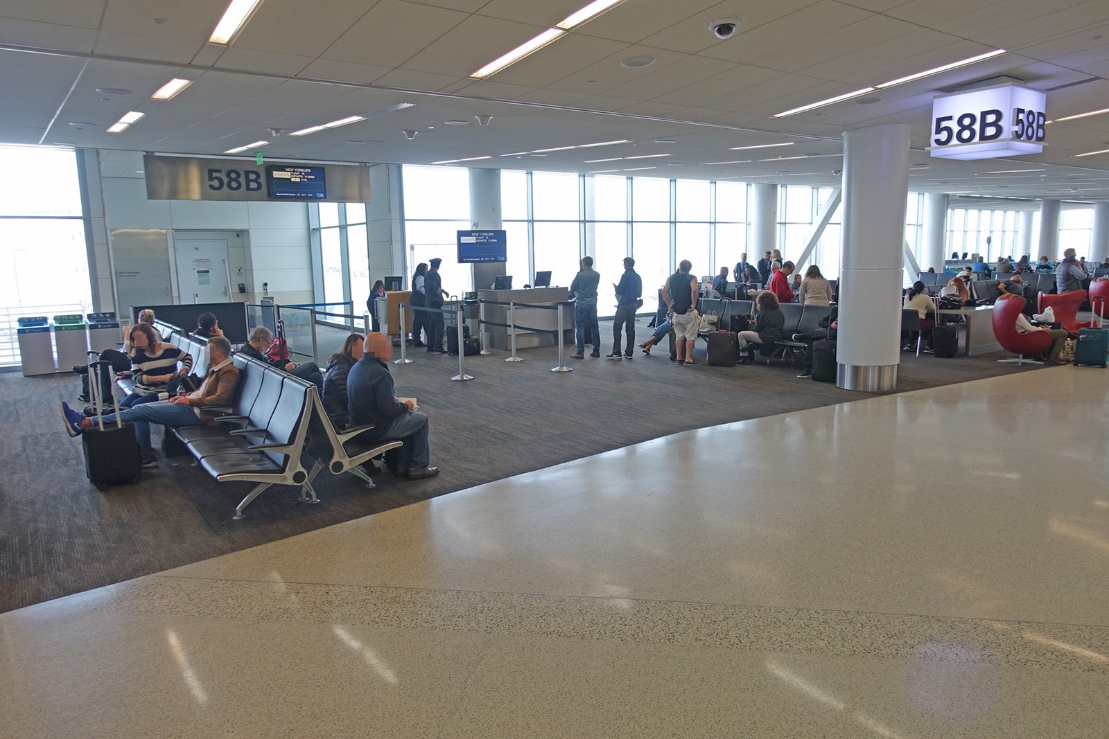 Gate 58B offered lots of free seats and, mercifully, no assault by passengers crowding the boarding lanes before their zone was called.