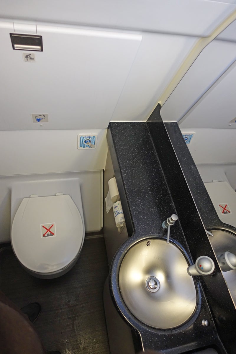 The single business-class bathroom at the front of the cabin, a standard-sized A321 lavatory, served all 20 passengers. First class had one bathroom for 10 people, and economy had two total, or one per 36 passengers.