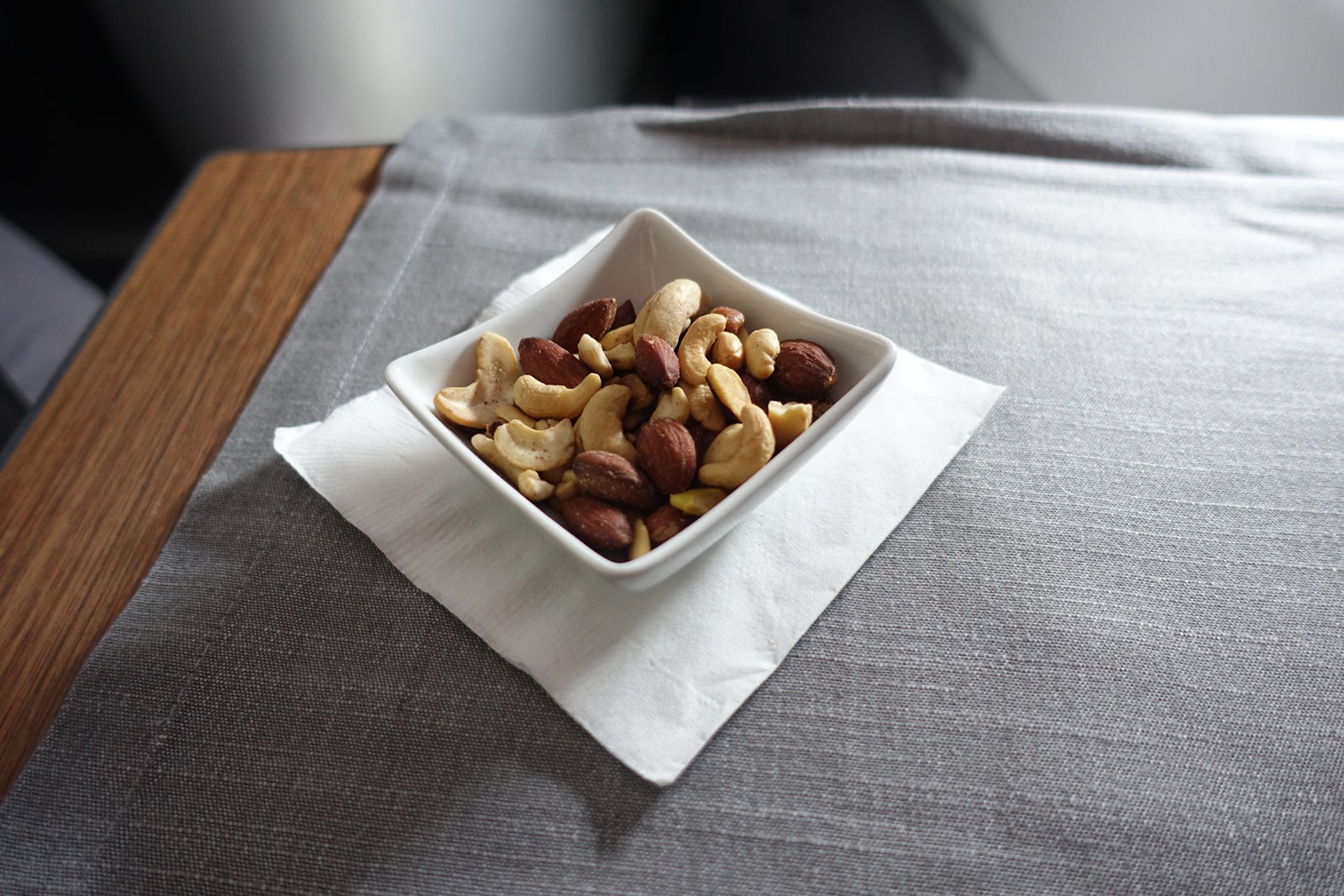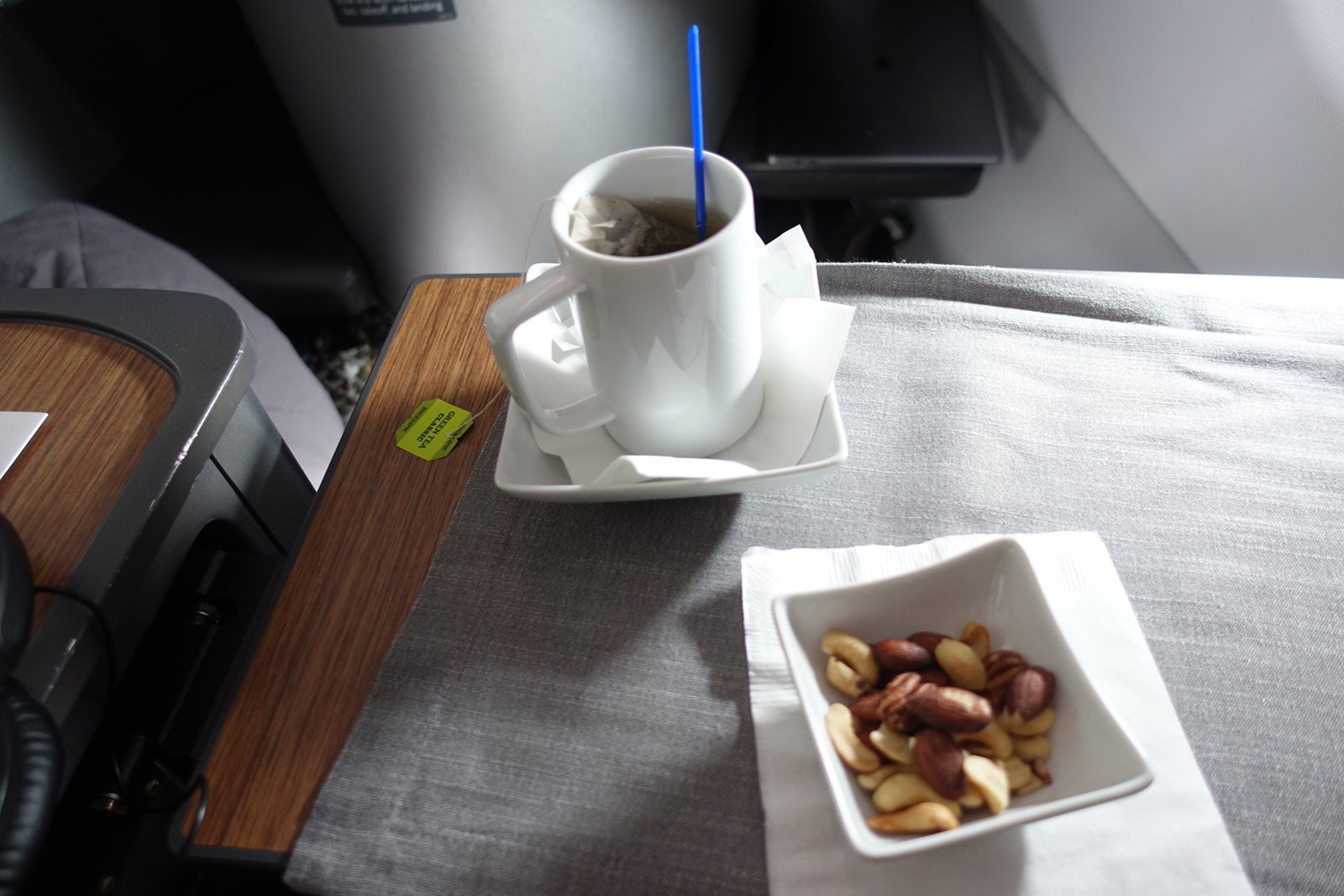 At half past noon San Francisco time, cloth placemats were laid on the tray tables, and a pleasantly warm appetizer of mixed nuts was served. I asked for green tea with sugar, which was promptly brought. I hope in Flagship First they had real spoons, though, not the wasteful and ugly plastic stirrers we got in biz.