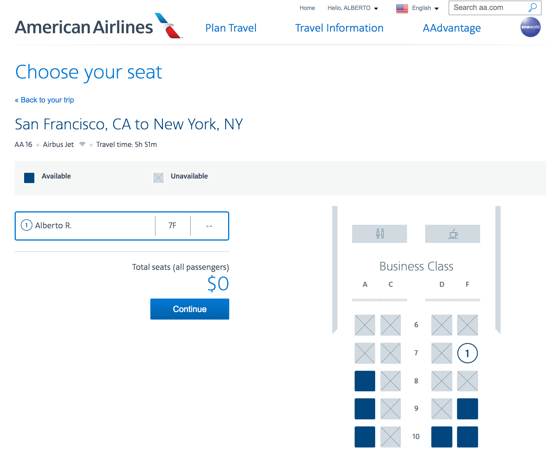 On the AA site, I selected Seat 7F, by a starboard window, a few weeks before the flight. Biz class looked like it would be full by the time of the flight, and indeed it was.
