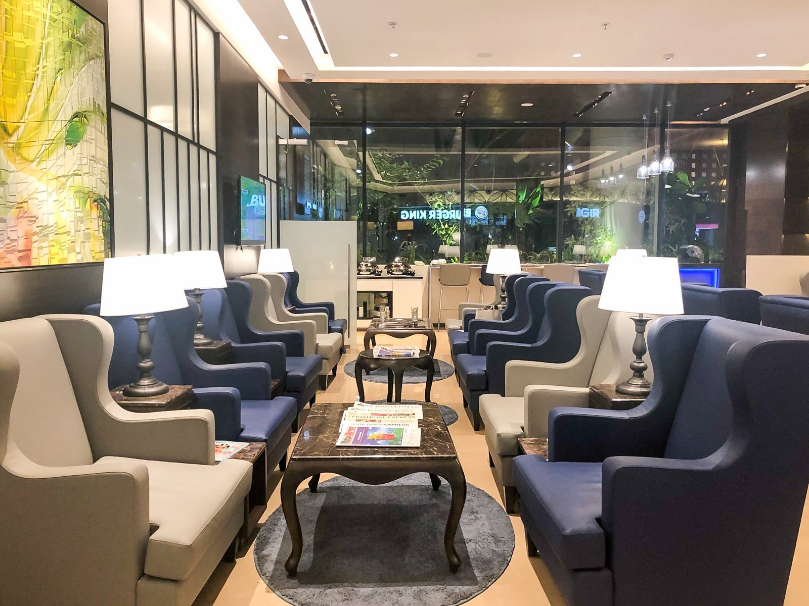 Four rows of leather armchairs lined this space, with USB and AC charging ports between. The low tables between chair clusters could easily be used for eating, though they were not the best for working. Overall, it felt spacious enough, and it didn't feel like I was invading someone else's personal space while sitting here.