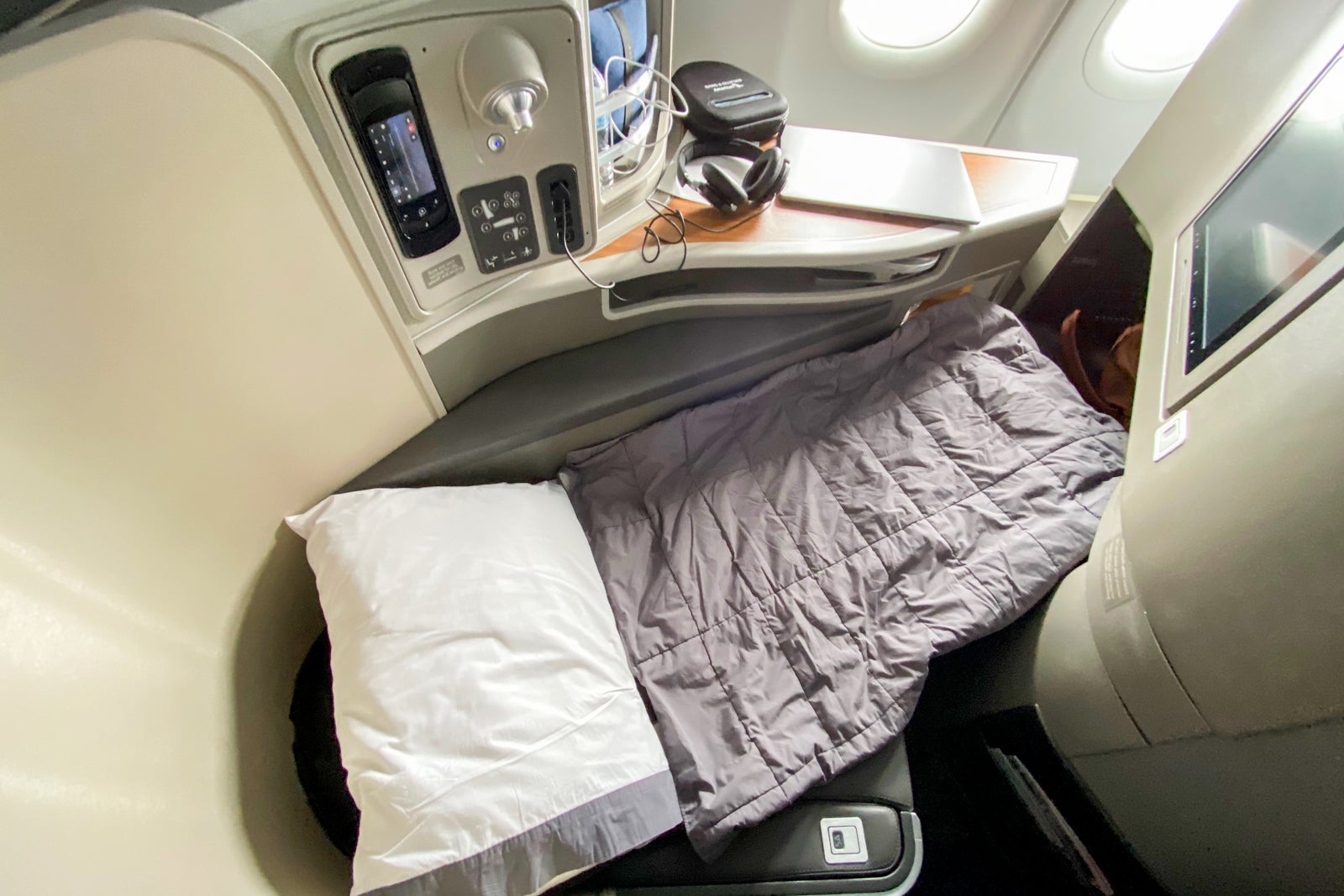 Casper bedding was also plastic-wrapped and waiting at my seat. Again, this was the business class bedding. While there was no extra day blanket or lumbar pillow usually found in first, the duvet and standard pillow did the job for the five-hour afternoon flight.