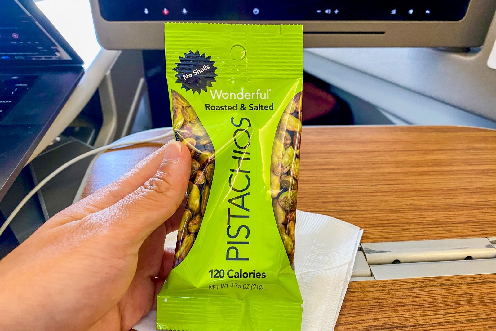 While warm mixed nuts are no longer served, a bag of pistachios was handed out. Immediately after, the hot meal arrived covered in plastic and foil and served all on one tray. However, I was amazed to see the use of real dishware, silverware and even a linen tablecloth.